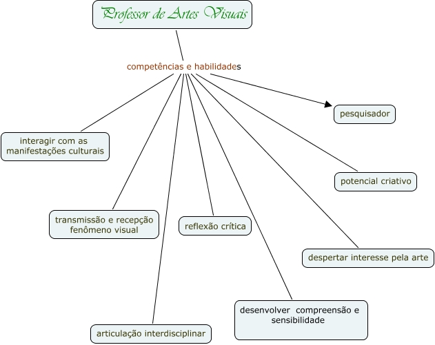 Esse mapa conceitual, produzido no IHMC CmapTools, tem a informação relacionada a: Currículo Professor Artes Visuais, Professor de Artes Visuais competências e habilidades despertar interesse pela arte, Professor de Artes Visuais competências e habilidades transmissão e recepção fenômeno visual, Professor de Artes Visuais competências e habilidades reflexão crítica, Professor de Artes Visuais competências e habilidades pesquisador, Professor de Artes Visuais competências e habilidades desenvolver compreensão e sensibilidade, Professor de Artes Visuais competências e habilidades articulação interdisciplinar, Professor de Artes Visuais competências e habilidades interagir com as manifestações culturais, Professor de Artes Visuais competências e habilidades potencial criativo