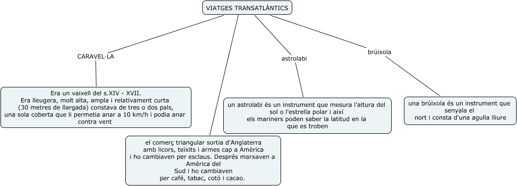 Este Cmap, tiene información relacionada con: barnatviatgestrasanlantics, VIATGES TRANSATLÀNTICS brúixola una brúixola és un instrument que senyala el nort i consta d'una agulla lliure, VIATGES TRANSATLÀNTICS ???? el comerç triangular sortia d'Anglaterra amb licors, teixits i armes cap a Amèrica i ho cambiaven per esclaus. Després marxaven a Amèrica del Sud i ho cambiaven per café, tabac, cotó i cacao., VIATGES TRANSATLÀNTICS astrolabi un astrolabi és un instrument que mesura l'altura del sol o l'estrella polar i així els mariners poden saber la latitud en la que es troben, VIATGES TRANSATLÀNTICS CARAVEL·LA Era un vaixell del s.XIV - XVII. Era lleugera, molt alta, ampla i relativament curta (30 metres de llargada) constava de tres o dos pals, una sola coberta que li permetia anar a 10 km/h i podia anar contra vent