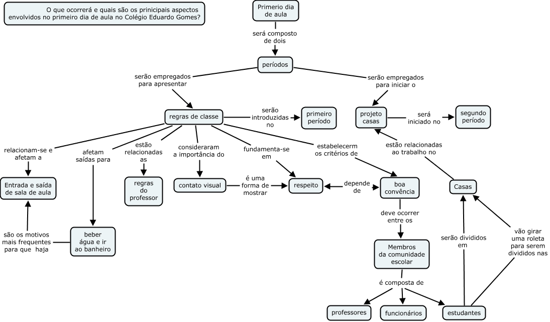 Esse mapa conceitual, produzido no IHMC CmapTools, tem a informação relacionada a: Primeiro dia, Membros da comunidade escolar é composta de funcionários, projeto casas será iniciado no segundo período, boa convência deve ocorrer entre os Membros da comunidade escolar, regras de classe serão introduzidas no primeiro período, regras de classe consideraram a importância do contato visual, estudantes serão divididos em Casas, estudantes vão girar uma roleta para serem divididos nas Casas, beber água e ir ao banheiro são os motivos mais frequentes para que haja Entrada e saída de sala de aula, regras de classe relacionam-se e afetam a Entrada e saída de sala de aula, Casas estão relacionadas ao trabalho no projeto casas, Membros da comunidade escolar é composta de estudantes, regras de classe estão relacionadas as regras do professor, períodos serão empregados para apresentar regras de classe, Primerio dia de aula será composto de dois períodos, regras de classe afetam saídas para beber água e ir ao banheiro, regras de classe fundamenta-se em respeito, regras de classe estabelecerm os critérios de boa convência, períodos serão empregados para iniciar o projeto casas, Membros da comunidade escolar é composta de professores