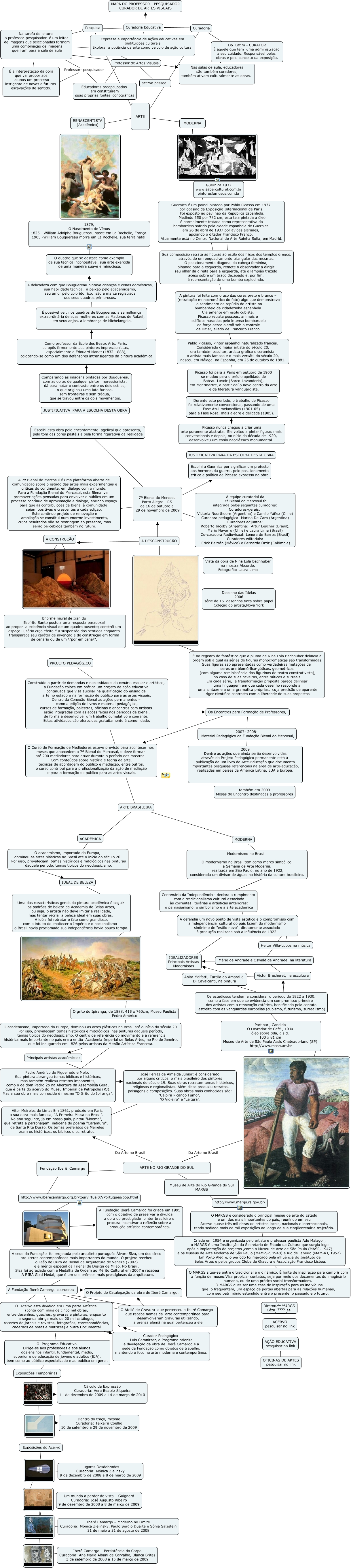 Esse mapa conceitual, produzido no IHMC CmapTools, tem a informação relacionada a: Mapa Professor - pesquisador -curador, ???? Lugares Desdobrados Curadoria: Mônica Zielinsky 9 de dezembro de 2008 a 8 de março de 2009, O MARGS situa-se entre o tradicional e o dinâmico. É fonte de inspiração para cumprir com a função de museu.Visa propiciar contatos, seja por meio dos documentos do imaginário humano, ou de uma prática social transformadora. O MARGS quer ser uma casa de inspiração para os indivíduos que o freqüentam, um espaço de portas abertas para as relações humanas, com seu patrimônio estendido entre o presente, o passado e o futuro. ???? Diretor do MARGS Cézar Prestes, Victor Brecheret, na escultura IDEALIZADORES Principais Artistas Modernistas, ARTE ???? RENASCENTISTA (Acadêmica), Curadoria ???? ARTE, Curadoria ???? ARTE, Durante este período, o trabalho de Picasso foi relativamente convencional, passando de uma Fase Azul melancólica (1901-05) para a Fase Rosa, mais alegre e delicada (1905). ???? Picasso nunca chegou a criar uma arte puramente abstrata. Ele voltou a pintar figuras mais convencionais e depois, no nício da década de 1920, desenvolveu um estilo neoclássico monumental., ???? Exposições do Acervo, O MARGS é considerado o principal museu de arte do Estado e um dos mais importantes do país, reunindo em seu Acervo quase três mil obras de artistas locais, nacionais e internacionais, tendo sediado mais de mil exposições ao longo de sua cinqüentenária trajetória. ???? Criada em 1954 e organizada pelo artista e professor paulista Ado Malagoli, o MARGS é uma Instituição da Secretaria de Estado da Cultura que surgiu logo após a implantação de projetos ,como o Museu de Arte de São Paulo (MASP, 1947) e os Museus de Arte Moderna de São Paulo (MAM-SP, 1948) e Rio de Janeiro (MAM-RJ, 1952). Em Porto Alegre, o período foi marcado pela influência do Instituto de Belas Artes e pelos grupos Clube de Gravura e Associação Francisco Lisboa., Uma das características gerais da pintura acadêmica é seguir os padrões de beleza da Academia de Belas Artes, ou seja, o artista não deve imitar a realidade, mas tentar recriar a beleza ideal em suas obras. A idéia foi retratar o fato como grandioso, com o intuito de enaltecer o Império e o nacionalismo - o Brasil havia proclamado sua independência havia pouco tempo. ????, Os estudiosos tendem a considerar o período de 1922 a 1930, como a fase em que se evidencia um compromisso primeiro dos artistas com a renovação estética, beneficiada pelo contato estreito com as vanguardas européias (cubismo, futurismo, surrealismo) ???? Portinari, Candido O Lavrador de Café , 1934 óleo sobre tela, c.s.d. 100 x 81 cm Museu de Arte de São Paulo Assis Chateaubriand (SP) http://www.masp.art.br, A DESCONSTRUÇÃO ????, Anita Malfatti, Tarcila do Amaral e Di Cavalcanti, na pintura ???? Victor Brecheret, na escultura, A CONSTRUÇÃO ????, ARTE BRASILEIRA ???? ACADÊMICA, Construído a partir de demandas e necessidades do cenário escolar e artístico, a Fundação coloca em prática um projeto de ação educativa continuada que visa auxiliar na qualificação do ensino da arte no estado e na formação de público para as artes visuais. Dentro da Conexão Bienal as ações permanentes – como a edição de livros e material pedagógico, cursos de formação, palestras, oficinas e encontros com artistas - estão integradas com as ações feitas nos períodos de Bienal, de forma a desenvolver um trabalho cumulativo e coerente. Estas atividades são oferecidas gratuitamente à comunidade. ???? Os Encontros para Formação de Professores,, ARTE NO RIO GRANDE DO SUL Da Arte no Brasil Vitor Meireles de Lima: Em 1861, produziu em Paris a sua obra mais famosa, "A Primeira Missa no Brasil". No ano seguinte, já em nosso país, pintou "Moema", que retrata a personagem indígena do poema "Caramuru", de Santa Rita Durão. Os temas preferidos de Meireles eram os históricos, os bíblicos e os retratos., ???? Iberê Camargo – Persistência do Corpo Curadoria: Ana Maria Albani de Carvalho, Blanca Brites 3 de setembro de 2008 a 15 de março de 2009, Na tarefa de leitura o professor-pesquisador é um leitor de imagens que selecionadas formam uma combinação de imagens que iram para a sala de aula ???? É a interpretação da obra que vai propor aos alunos um processo instigante de novas e futuras escavações de sentido., Mário de Andrade e Oswald de Andrade, na literatura ???? Victor Brecheret, na escultura
