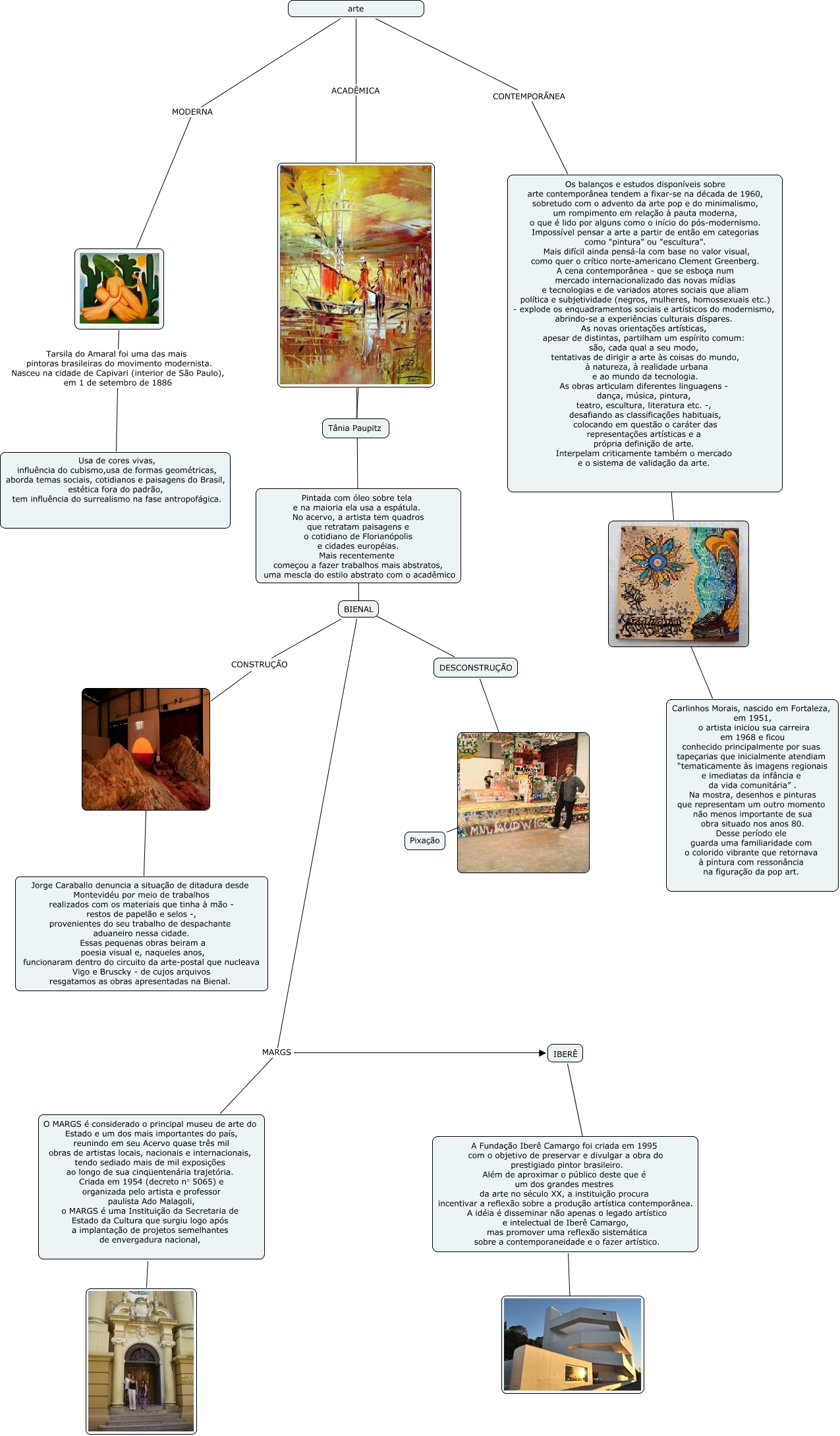 Esse mapa conceitual, produzido no IHMC CmapTools, tem a informação relacionada a: mapa professor-pesquisador-curador, ???? Jorge Caraballo denuncia a situação de ditadura desde Montevidéu por meio de trabalhos realizados com os materiais que tinha à mão - restos de papelão e selos -, provenientes do seu trabalho de despachante aduaneiro nessa cidade. Essas pequenas obras beiram a poesia visual e, naqueles anos, funcionaram dentro do circuito da arte-postal que nucleava Vigo e Bruscky - de cujos arquivos resgatamos as obras apresentadas na Bienal., DESCONSTRUÇÃO ????, BIENAL DESCONSTRUÇÃO, A Fundação Iberê Camargo foi criada em 1995 com o objetivo de preservar e divulgar a obra do prestigiado pintor brasileiro. Além de aproximar o público deste que é um dos grandes mestres da arte no século XX, a instituição procura incentivar a reflexão sobre a produção artística contemporânea. A idéia é disseminar não apenas o legado artístico e intelectual de Iberê Camargo, mas promover uma reflexão sistemática sobre a contemporaneidade e o fazer artístico. ????, ???? Carlinhos Morais, nascido em Fortaleza, em 1951, o artista iniciou sua carreira em 1968 e ficou conhecido principalmente por suas tapeçarias que inicialmente atendiam “tematicamente às imagens regionais e imediatas da infância e da vida comunitária” . Na mostra, desenhos e pinturas que representam um outro momento não menos importante de sua obra situado nos anos 80. Desse período ele guarda uma familiaridade com o colorido vibrante que retornava à pintura com ressonância na figuração da pop art., arte MODERNA, Tarsila do Amaral foi uma das mais pintoras brasileiras do movimento modernista. Nasceu na cidade de Capivari (interior de São Paulo), em 1 de setembro de 1886 Usa de cores vivas, influência do cubismo,usa de formas geométricas, aborda temas sociais, cotidianos e paisagens do Brasil, estética fora do padrão, tem influência do surrealismo na fase antropofágica., ???? Tânia Paupitz, BIENAL MARGS IBERÊ, IBERÊ ???? A Fundação Iberê Camargo foi criada em 1995 com o objetivo de preservar e divulgar a obra do prestigiado pintor brasileiro. Além de aproximar o público deste que é um dos grandes mestres da arte no século XX, a instituição procura incentivar a reflexão sobre a produção artística contemporânea. A idéia é disseminar não apenas o legado artístico e intelectual de Iberê Camargo, mas promover uma reflexão sistemática sobre a contemporaneidade e o fazer artístico., O MARGS é considerado o principal museu de arte do Estado e um dos mais importantes do país, reunindo em seu Acervo quase três mil obras de artistas locais, nacionais e internacionais, tendo sediado mais de mil exposições ao longo de sua cinqüentenária trajetória. Criada em 1954 (decreto n° 5065) e organizada pelo artista e professor paulista Ado Malagoli, o MARGS é uma Instituição da Secretaria de Estado da Cultura que surgiu logo após a implantação de projetos semelhantes de envergadura nacional, ????, BIENAL CONSTRUÇÃO, arte ACADÊMICA, Os balanços e estudos disponíveis sobre arte contemporânea tendem a fixar-se na década de 1960, sobretudo com o advento da arte pop e do minimalismo, um rompimento em relação à pauta moderna, o que é lido por alguns como o início do pós-modernismo. Impossível pensar a arte a partir de então em categorias como "pintura" ou "escultura". Mais difícil ainda pensá-la com base no valor visual, como quer o crítico norte-americano Clement Greenberg. A cena contemporânea - que se esboça num mercado internacionalizado das novas mídias e tecnologias e de variados atores sociais que aliam política e subjetividade (negros, mulheres, homossexuais etc.) - explode os enquadramentos sociais e artísticos do modernismo, abrindo-se a experiências culturais díspares. As novas orientações artísticas, apesar de distintas, partilham um espírito comum: são, cada qual a seu modo, tentativas de dirigir a arte às coisas do mundo, à natureza, à realidade urbana e ao mundo da tecnologia. As obras articulam diferentes linguagens - dança, música, pintura, teatro, escultura, literatura etc. -, desafiando as classificações habituais, colocando em questão o caráter das representações artísticas e a própria definição de arte. Interpelam criticamente também o mercado e o sistema de validação da arte. ????, DESCONSTRUÇÃO ???? Pixação, BIENAL MARGS O MARGS é considerado o principal museu de arte do Estado e um dos mais importantes do país, reunindo em seu Acervo quase três mil obras de artistas locais, nacionais e internacionais, tendo sediado mais de mil exposições ao longo de sua cinqüentenária trajetória. Criada em 1954 (decreto n° 5065) e organizada pelo artista e professor paulista Ado Malagoli, o MARGS é uma Instituição da Secretaria de Estado da Cultura que surgiu logo após a implantação de projetos semelhantes de envergadura nacional,, arte CONTEMPORÃNEA Os balanços e estudos disponíveis sobre arte contemporânea tendem a fixar-se na década de 1960, sobretudo com o advento da arte pop e do minimalismo, um rompimento em relação à pauta moderna, o que é lido por alguns como o início do pós-modernismo. Impossível pensar a arte a partir de então em categorias como "pintura" ou "escultura". Mais difícil ainda pensá-la com base no valor visual, como quer o crítico norte-americano Clement Greenberg. A cena contemporânea - que se esboça num mercado internacionalizado das novas mídias e tecnologias e de variados atores sociais que aliam política e subjetividade (negros, mulheres, homossexuais etc.) - explode os enquadramentos sociais e artísticos do modernismo, abrindo-se a experiências culturais díspares. As novas orientações artísticas, apesar de distintas, partilham um espírito comum: são, cada qual a seu modo, tentativas de dirigir a arte às coisas do mundo, à natureza, à realidade