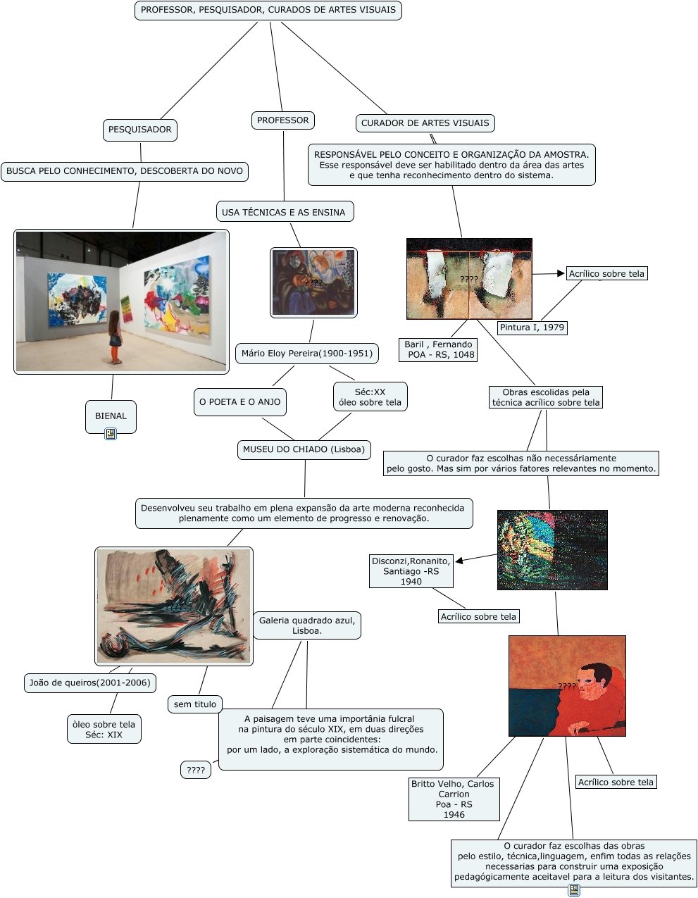 Esse mapa conceitual, produzido no IHMC CmapTools, tem a informação relacionada a: PROFESSOR, PESQUISADOR , CURADOR, ???? ???? Acrílico sobre tela, PROFESSOR ???? USA TÉCNICAS E AS ENSINA, ???? ???? Britto Velho, Carlos Carrion Poa - RS 1946, PROFESSOR, PESQUISADOR, CURADOS DE ARTES VISUAIS ???? CURADOR DE ARTES VISUAIS, ???? ???? Acrílico sobre tela, PESQUISADOR ???? ????, Galeria quadrado azul, Lisboa. ???? A paisagem teve uma importânia fulcral na pintura do século XIX, em duas direções em parte coincidentes: por um lado, a exploração sistemática do mundo., Mário Eloy Pereira(1900-1951) ???? Séc:XX óleo sobre tela, Obras escolidas pela técnica acrílico sobre tela ???? ????, O POETA E O ANJO ???? MUSEU DO CHIADO (Lisboa), ???? ???? O curador faz escolhas das obras pelo estilo, técnica,linguagem, enfim todas as relações necessarias para construir uma exposição pedagógicamente aceitavel para a leitura dos visitantes., Disconzi,Ronanito, Santiago -RS 1940 ???? Acrílico sobre tela, CURADOR DE ARTES VISUAIS ???? RESPONSÁVEL PELO CONCEITO E ORGANIZAÇÃO DA AMOSTRA. Esse responsável deve ser habilitado dentro da área das artes e que tenha reconhecimento dentro do sistema., CURADOR DE ARTES VISUAIS ???? ????, ???? ???? Mário Eloy Pereira(1900-1951), ???? ???? Disconzi,Ronanito, Santiago -RS 1940, Obras escolidas pela técnica acrílico sobre tela ???? O curador faz escolhas não necessáriamente pelo gosto. Mas sim por vários fatores relevantes no momento., PROFESSOR, PESQUISADOR, CURADOS DE ARTES VISUAIS ???? PROFESSOR, Mário Eloy Pereira(1900-1951) ???? O POETA E O ANJO, ???? ???? O curador faz escolhas das obras pelo estilo, técnica,linguagem, enfim todas as relações necessarias para construir uma exposição pedagógicamente aceitavel para a leitura dos visitantes.