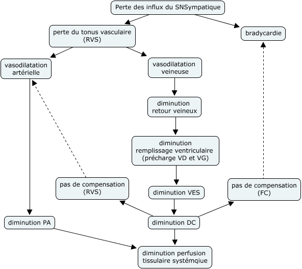 This Concept Map has information related to: Choc neurogénique, vasodilatation veineuse ???? diminution retour veineux, diminution PA ???? diminution perfusion tissulaire systémqiue, diminution DC ???? pas de compensation (FC), diminution retour veineux ???? diminution remplissage ventriculaire (précharge VD et VG), diminution remplissage ventriculaire (précharge VD et VG) ???? diminution VES, vasodilatation artérielle ???? diminution PA, perte du tonus vasculaire (RVS) ???? vasodilatation artérielle, diminution VES ???? diminution DC, Perte des influx du SNSympatique ???? perte du tonus vasculaire (RVS), diminution DC ???? pas de compensation (RVS)