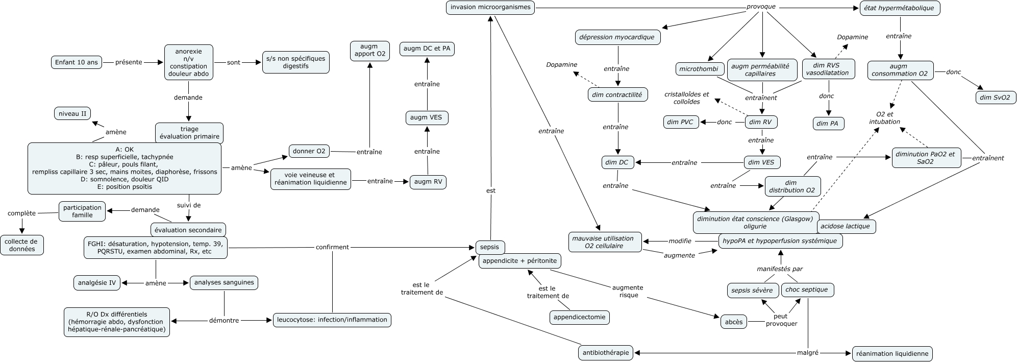 This Concept Map has information related to: Choc septiqueH10, invasion microorganismes provoque microthombi, FGHI: désaturation, hypotension, temp. 39, PQRSTU, examen abdominal, Rx, etc confirment sepsis, dim contractilité entraîne dim DC, dim RV donc dim PVC, augm consommation O2 donc dim SvO2, dim distribution O2 ???? diminution état conscience (Glasgow) oligurie, appendicectomie est le traitement de appendicite + péritonite, FGHI: désaturation, hypotension, temp. 39, PQRSTU, examen abdominal, Rx, etc amène analyses sanguines, dim RV entraîne dim VES, analyses sanguines démontre leucocytose: infection/inflammation