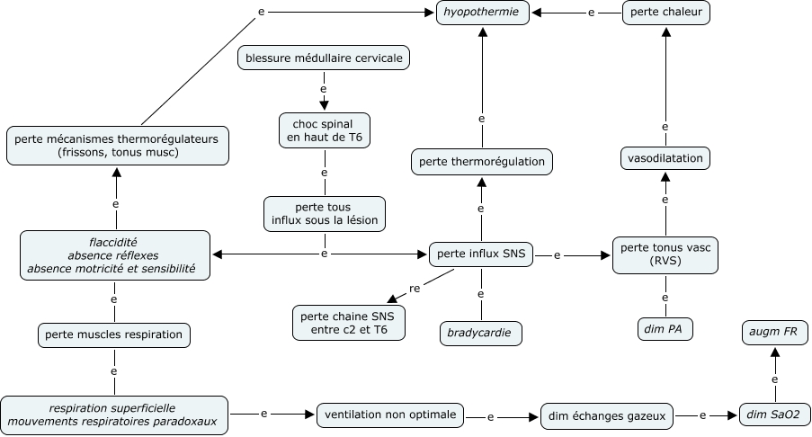 This Concept Map has information related to: Question examen BM, ventilation non optimale e dim échanges gazeux, blessure médullaire cervicale e choc spinal en haut de T6, dim échanges gazeux e dim SaO2, perte muscles respiration e respiration superficielle mouvements respiratoires paradoxaux, choc spinal en haut de T6 e perte tous influx sous la lésion, respiration superficielle mouvements respiratoires paradoxaux e ventilation non optimale, perte tonus vasc (RVS) e vasodilatation, perte mécanismes thermorégulateurs (frissons, tonus musc) e hyopothermie, dim SaO2 e augm FR, perte chaleur e hyopothermie