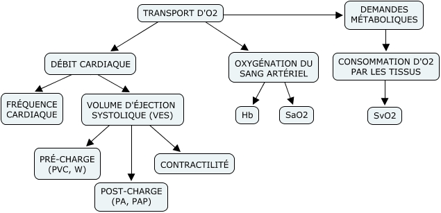 Cette carte de concepts créée avec IHMC CmapTools traite de: GG hémo, OXYGÉNATION DU SANG ARTÉRIEL ???? Hb, DEMANDES MÉTABOLIQUES ???? CONSOMMATION D'O2 PAR LES TISSUS, OXYGÉNATION DU SANG ARTÉRIEL ???? SaO2, VOLUME D'ÉJECTION SYSTOLIQUE (VES) ???? PRÉ-CHARGE (PVC, W), TRANSPORT D'O2 ???? DEMANDES MÉTABOLIQUES, VOLUME D'ÉJECTION SYSTOLIQUE (VES) ???? CONTRACTILITÉ, TRANSPORT D'O2 ???? DÉBIT CARDIAQUE, VOLUME D'ÉJECTION SYSTOLIQUE (VES) ???? POST-CHARGE (PA, PAP), DÉBIT CARDIAQUE ???? VOLUME D'ÉJECTION SYSTOLIQUE (VES), CONSOMMATION D'O2 PAR LES TISSUS ???? SvO2, TRANSPORT D'O2 ???? OXYGÉNATION DU SANG ARTÉRIEL, DÉBIT CARDIAQUE ???? FRÉQUENCE CARDIAQUE