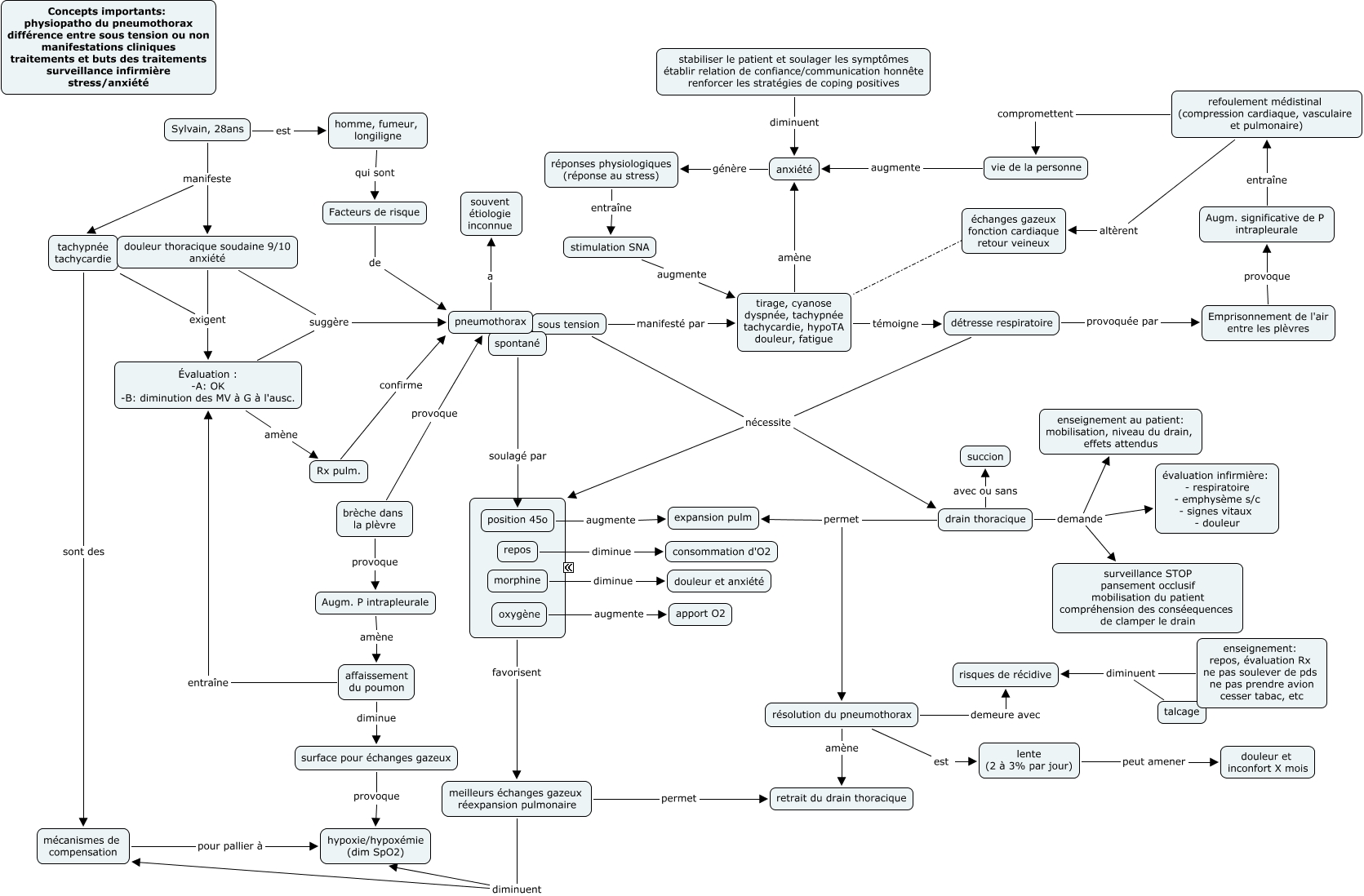 This Concept Map has information related to: SIC pneumothorax A09, stabiliser le patient et soulager les symptômes établir relation de confiance/communication honnête renforcer les stratégies de coping positives diminuent anxiété, vie de la personne augmente anxiété, surface pour échanges gazeux provoque hypoxie/hypoxémie (dim SpO2), drain thoracique demande surveillance STOP pansement occlusif mobilisation du patient compréhension des conséequences de clamper le drain, drain thoracique permet résolution du pneumothorax, drain thoracique permet expansion pulm, position 45o augmente expansion pulm, résolution du pneumothorax amène retrait du drain thoracique, anxiété génère réponses physiologiques (réponse au stress), Facteurs de risque de pneumothorax