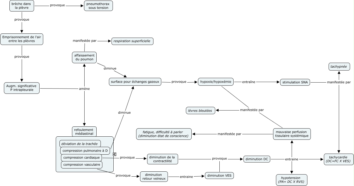 This Concept Map has information related to: Réponse Q pneumothorax_examen, diminution VES provoque diminution DC, affaissement du poumon manifestée par respiration superficielle, compression vasculaire provoque diminution retour veineux, diminution DC entraine hypotension (PA= DC X RVS), compression cardiaque provoque diminution de la contractilité, mauvaise perfusion tissulaire systémique manifestée par lèvres bleutées, diminution DC entraine tachycardie (DC=FC X VES), brèche dans la plèvre provoque pneumothorax sous tension, affaissement du poumon diminue surface pour échanges gazeux, diminution retour veineux entraine diminution VES