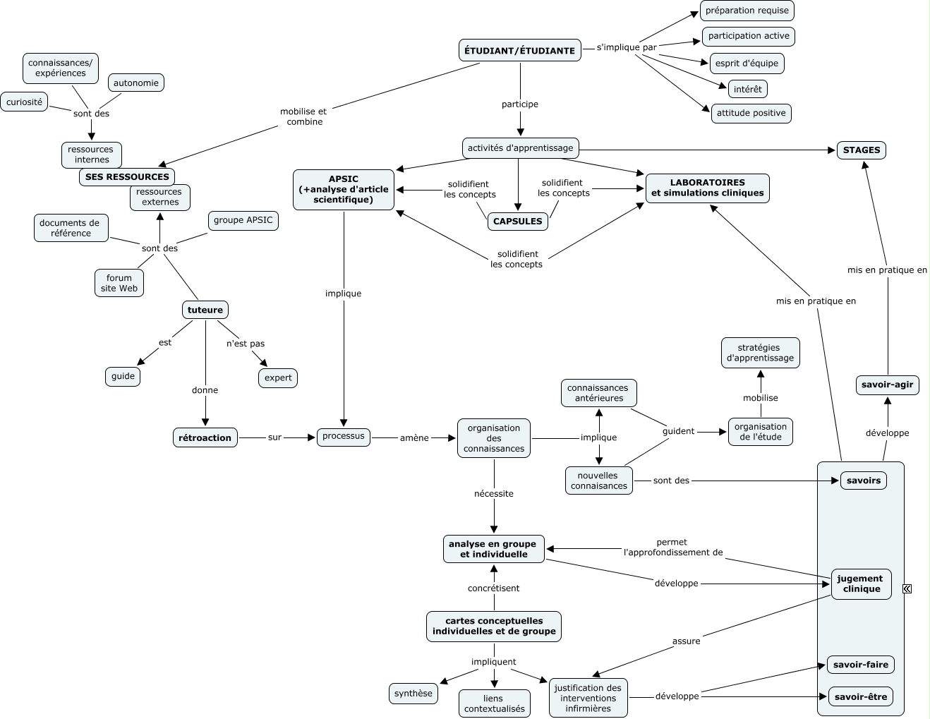 This Concept Map has information related to: Plan de cours, ???? développe savoir-agir, forum site Web sont des ressources externes, ÉTUDIANT/ÉTUDIANTE s'implique par intérêt, analyse en groupe et individuelle développe jugement clinique, connaissances antérieures guident organisation de l'étude, ÉTUDIANT/ÉTUDIANTE s'implique par préparation requise, activités d'apprentissage ???? APSIC (+analyse d'article scientifique), APSIC (+analyse d'article scientifique) implique processus, ÉTUDIANT/ÉTUDIANTE s'implique par participation active, organisation des connaissances nécessite analyse en groupe et individuelle