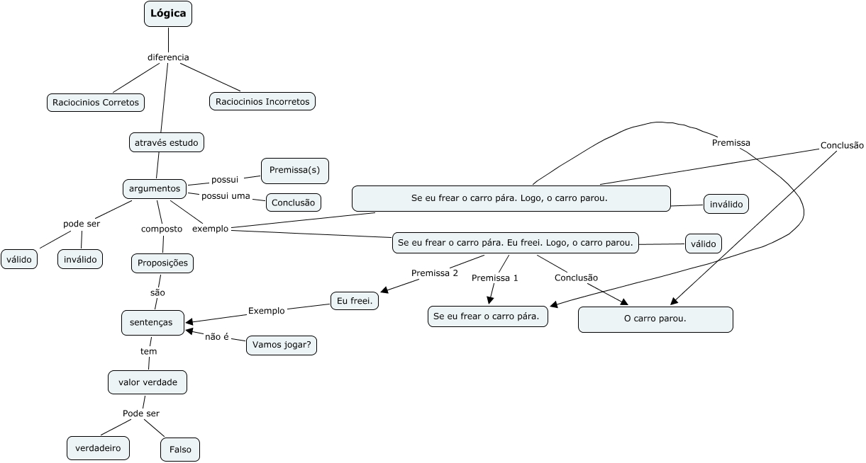 Esse mapa conceitual, produzido no IHMC CmapTools, tem a informação relacionada a: Lógica, Lógica diferencia argumentos, Proposições são sentenças, Se eu frear o carro pára. Logo, o carro parou. Premissa Se eu frear o carro pára., argumentos composto Proposições, argumentos possui Premissa(s), Falso Pode ser verdadeiro, Se eu frear o carro pára. Eu freei. Logo, o carro parou. Premissa 1 Se eu frear o carro pára., Vamos jogar? não é sentenças, valor verdade Pode ser verdadeiro, Se eu frear o carro pára. Logo, o carro parou. Conclusão O carro parou., argumentos possui uma Conclusão, sentenças tem valor verdade, Se eu frear o carro pára. Logo, o carro parou. ???? inválido, Se eu frear o carro pára. Eu freei. Logo, o carro parou. Premissa 2 Eu freei., argumentos exemplo Se eu frear o carro pára. Logo, o carro parou., válido ???? Se eu frear o carro pára. Eu freei. Logo, o carro parou., argumentos exemplo Se eu frear o carro pára. Eu freei. Logo, o carro parou., Lógica diferencia Raciocinios Incorretos, argumentos pode ser válido, Lógica diferencia Raciocinios Corretos
