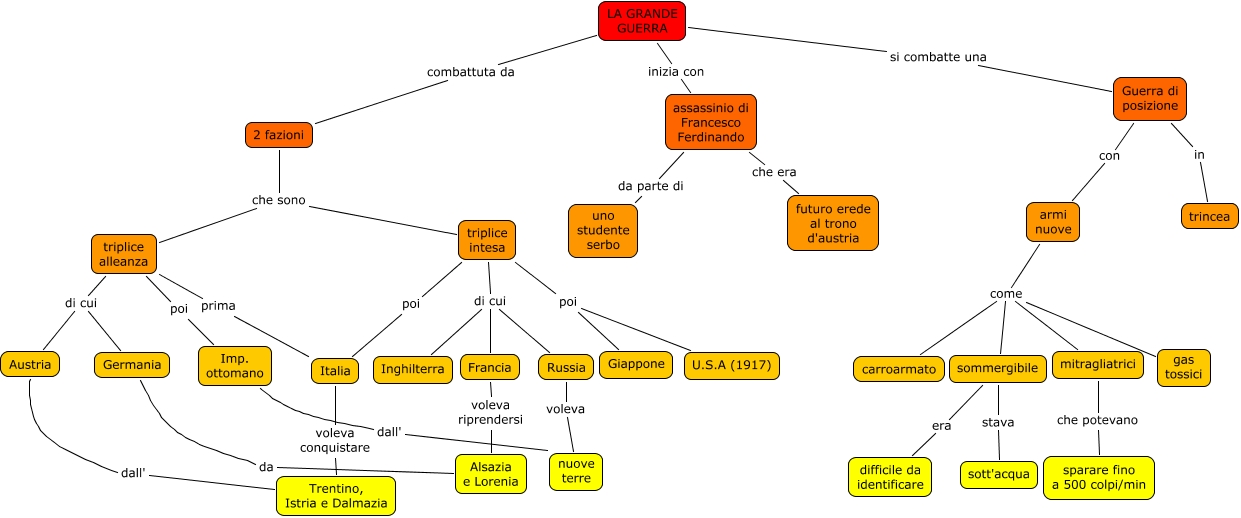 Questa Cmap, creata con IHMC CmapTools, contiene informazioni relative a: La Grande Guerra, triplice alleanza prima Italia, triplice intesa di cui Russia, triplice alleanza di cui Germania, triplice intesa di cui Francia, triplice alleanza poi Imp. ottomano, Francia voleva riprendersi Alsazia e Lorenia, mitragliatrici che potevano sparare fino a 500 colpi/min, LA GRANDE GUERRA si combatte una Guerra di posizione, LA GRANDE GUERRA inizia con assassinio di Francesco Ferdinando, sommergibile stava sott'acqua, assassinio di Francesco Ferdinando che era futuro erede al trono d'austria, assassinio di Francesco Ferdinando da parte di uno studente serbo, triplice alleanza di cui Austria, Guerra di posizione con armi nuove, triplice intesa poi Giappone, Guerra di posizione in trincea, triplice intesa di cui Inghilterra, Alsazia e Lorenia da Germania, sommergibile era difficile da identificare, LA GRANDE GUERRA combattuta da 2 fazioni