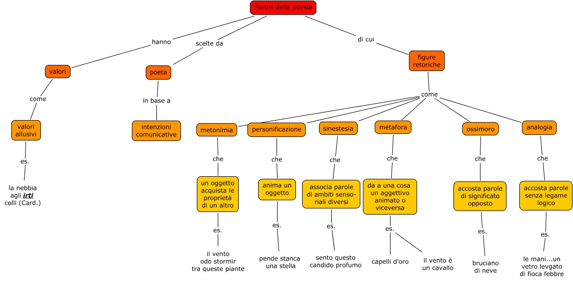 Questa Cmap, creata con IHMC CmapTools, contiene informazioni relative a: parole della poesia, accosta parole senza legame logico es. le mani...un vetro levgato di fioca febbre, valori allusivi es. la nebbia agli irti colli (Card.), figure retoriche come metafora, un oggetto acquista le proprietà di un altro es. il vento odo stormir tra queste piante, da a una cosa un aggettivo animato o viceversa es. il vento è un cavallo, metonimia che un oggetto acquista le proprietà di un altro, figure retoriche come sinestesia, figure retoriche come ossimoro, sinestesia che associa parole di ambiti senso- riali diversi, metafora che da a una cosa un aggettivo animato o viceversa, figure retoriche come metonimia, Parole della poesia scelte da poeta, poeta in base a intenzioni comunicative, da a una cosa un aggettivo animato o viceversa es. capelli d'oro, Parole della poesia di cui figure retoriche, valori come valori allusivi, personificazione che anima un oggetto, ossimoro che accosta parole di significato opposto, figure retoriche come personificazione, anima un oggetto es. pende stanca una stella