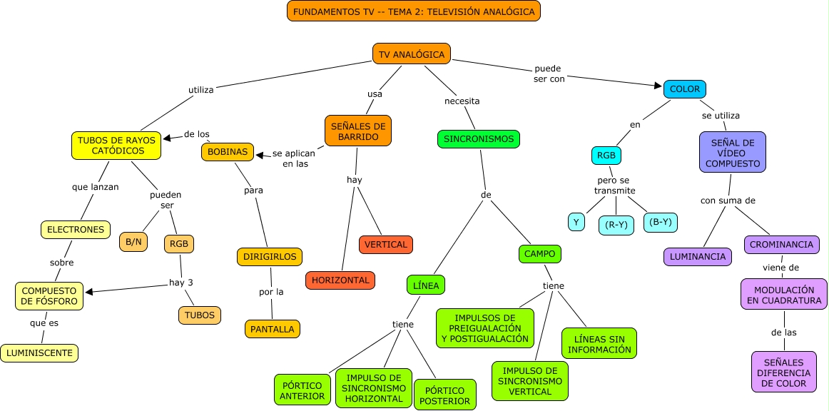 Este Cmap, tiene información relacionada con: Tema 2 TV analógica, TUBOS DE RAYOS CATÓDICOS pueden ser RGB, TV ANALÓGICA puede ser con COLOR, DIRIGIRLOS por la PANTALLA, CAMPO tiene LÍNEAS SIN INFORMACIÓN, TUBOS DE RAYOS CATÓDICOS que lanzan ELECTRONES, SINCRONISMOS de CAMPO, LÍNEA tiene IMPULSO DE SINCRONISMO HORIZONTAL, RGB pero se transmite Y, MODULACIÓN EN CUADRATURA de las SEÑALES DIFERENCIA DE COLOR, RGB pero se transmite (R-Y), RGB hay 3 COMPUESTO DE FÓSFORO, TUBOS DE RAYOS CATÓDICOS pueden ser B/N, SEÑALES DE BARRIDO se aplican en las BOBINAS, SINCRONISMOS de LÍNEA, RGB pero se transmite (B-Y), TV ANALÓGICA utiliza TUBOS DE RAYOS CATÓDICOS, BOBINAS de los TUBOS DE RAYOS CATÓDICOS, LÍNEA tiene PÓRTICO ANTERIOR, SEÑALES DE BARRIDO hay VERTICAL, CAMPO tiene IMPULSO DE SINCRONISMO VERTICAL