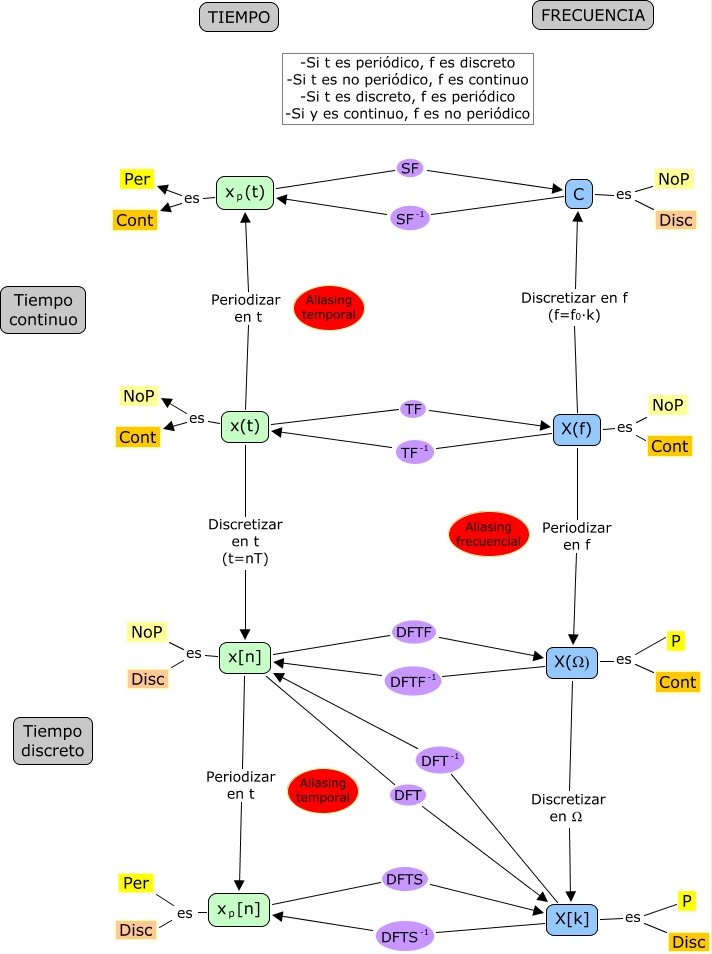 (f=f0·k) </mtext> </mrow> </math> C, X[k] es P, X[k] <math xmlns="http://www.w3.org/1998/Math/MathML"> <mrow> <mmultiscripts> <mtext> DFTS </mtext> <none/> <mtext> -1 </mtext> </mmultiscripts> </mrow> </math> <math xmlns="http://www.w3.org/1998/Math/MathML"> <mrow> <mmultiscripts> <mtext> x </mtext> <mtext> p </mtext> <none/> </mmultiscripts> <mtext> [n] </mtext> </mrow> </math>, <math xmlns="http://www.w3.org/1998/Math/MathML"> <mrow> <mmultiscripts> <mtext> x </mtext> <mtext> p </mtext> <none/> </mmultiscripts> <mtext> (t) </mtext> </mrow> </math> es Cont, x(t) es NoP, <math xmlns="http://www.w3.org/1998/Math/MathML"> <mrow> <mmultiscripts> <mtext> x </mtext> <mtext> p </mtext> <none/> </mmultiscripts> <mtext> [n] </mtext> </mrow> </math> DFTS X[k], X(Ω) es Cont, X(f) <math xmlns="http://www.w3.org/1998/Math/MathML"> <mrow> <mmultiscripts> <mtext> TF </mtext> <none/> <mtext> -1 </mtext> </mmultiscripts> </mrow> </math> x(t), x[n] es Disc, X(Ω) <math xmlns="http://www.w3.org/1998/Math/MathML"> <mrow> <mmultiscripts> <mtext> DFTF </mtext> <none/> <mtext> -1 </mtext> </mmultiscripts> </mrow> </math> x[n], x[n] DFTF X(Ω), X[k] es Disc, x[n] DFT X[k], X(f) es NoP, x[n] es NoP, <math xmlns="http://www.w3.org/1998/Math/MathML"> <mrow> <mmultiscripts> <mtext> x </mtext> <mtext> p </mtext> <none/> </mmultiscripts> <mtext> [n] </mtext> </mrow> </math> es Disc, C es NoP, x[n] Periodizar en t <math xmlns="http://www.w3.org/1998/Math/MathML"> <mrow> <mmultiscripts> <mtext> x </mtext> <mtext> p </mtext> <none/> </mmultiscripts> <mtext> [n] </mtext> </mrow> </math>