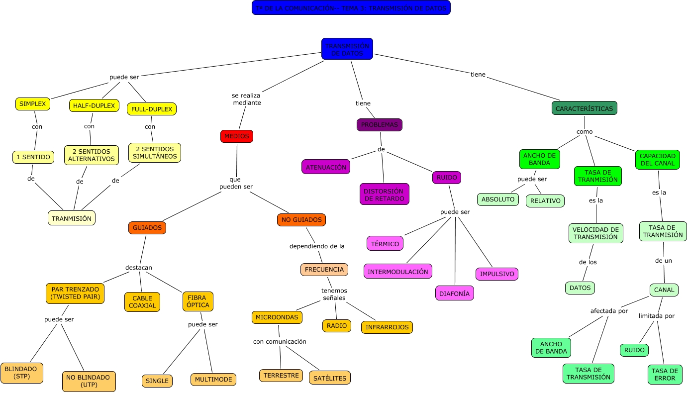 Este Cmap, tiene información relacionada con: Tema 3 Transmisión de datos, ANCHO DE BANDA puede ser RELATIVO, PROBLEMAS de RUIDO, FIBRA ÓPTICA puede ser MULTIMODE, RUIDO puede ser IMPULSIVO, PROBLEMAS de ATENUACIÓN, FRECUENCIA tenemos señales INFRARROJOS, FIBRA ÓPTICA puede ser SINGLE, 2 SENTIDOS SIMULTÁNEOS de TRANMISIÓN, GUIADOS destacan FIBRA ÓPTICA, TASA DE TRANMISIÓN es la VELOCIDAD DE TRANSMISIÓN, TRANSMISIÓN DE DATOS se realiza mediante MEDIOS, VELOCIDAD DE TRANSMISIÓN de los DATOS, PAR TRENZADO (TWISTED PAIR) puede ser NO BLINDADO (UTP), RUIDO puede ser INTERMODULACIÓN, TRANSMISIÓN DE DATOS puede ser HALF-DUPLEX, TRANSMISIÓN DE DATOS tiene PROBLEMAS, CARACTERÍSTICAS como ANCHO DE BANDA, FRECUENCIA tenemos señales RADIO, CANAL afectada por ANCHO DE BANDA, RUIDO puede ser DIAFONÍA