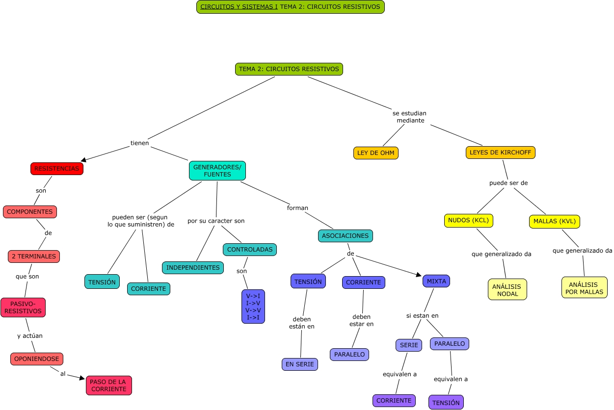 Este Cmap, tiene información relacionada con: Tema 2 Circuitos resistivos (Esquema general), LEYES DE KIRCHOFF puede ser de MALLAS (KVL), CONTROLADAS son V->I I->V V->V I->I, NUDOS (KCL) que generalizado da ANÁLISIS NODAL, MALLAS (KVL) que generalizado da ANÁLISIS POR MALLAS, PASIVO- RESISTIVOS y actúan OPONIENDOSE, SERIE equivalen a CORRIENTE, MIXTA si estan en SERIE, 2 TERMINALES que son PASIVO- RESISTIVOS, TEMA 2: CIRCUITOS RESISTIVOS se estudian mediante LEY DE OHM, MIXTA si estan en PARALELO, ASOCIACIONES de TENSIÓN, RESISTENCIAS son COMPONENTES, TEMA 2: CIRCUITOS RESISTIVOS se estudian mediante LEYES DE KIRCHOFF, ASOCIACIONES de CORRIENTE, GENERADORES/ FUENTES forman ASOCIACIONES, TEMA 2: CIRCUITOS RESISTIVOS tienen RESISTENCIAS, LEYES DE KIRCHOFF puede ser de NUDOS (KCL), GENERADORES/ FUENTES por su caracter son INDEPENDIENTES, GENERADORES/ FUENTES por su caracter son CONTROLADAS, COMPONENTES de 2 TERMINALES