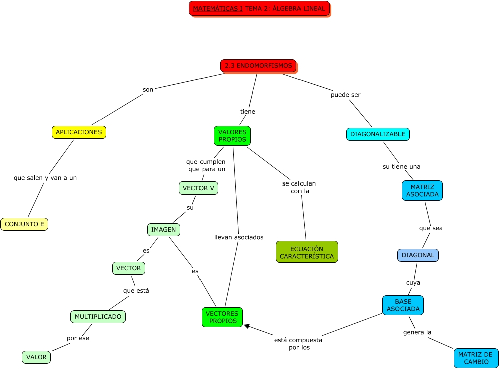 Este Cmap, tiene información relacionada con: Tema 2.3 Endomorfismos, DIAGONALIZABLE su tiene una MATRIZ ASOCIADA, DIAGONAL cuya BASE ASOCIADA, 2.3 ENDOMORFISMOS son APLICACIONES, VECTOR que está MULTIPLICADO, 2.3 ENDOMORFISMOS puede ser DIAGONALIZABLE, VALORES PROPIOS que cumplen que para un VECTOR V, VALORES PROPIOS se calculan con la ECUACIÓN CARACTERÍSTICA, 2.3 ENDOMORFISMOS tiene VALORES PROPIOS, VECTOR V su IMAGEN, BASE ASOCIADA genera la MATRIZ DE CAMBIO, IMAGEN es VECTORES PROPIOS, MATRIZ ASOCIADA que sea DIAGONAL, IMAGEN es VECTOR, APLICACIONES que salen y van a un CONJUNTO E, VALORES PROPIOS llevan asociados VECTORES PROPIOS, BASE ASOCIADA está compuesta por los VECTORES PROPIOS, MULTIPLICADO por ese VALOR