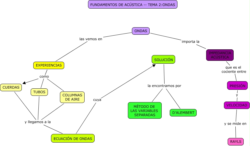 Este Cmap, tiene información relacionada con: Tema 2 Ondas, EXPERIENCIAS como COLUMNAS DE AIRE, ONDAS importa la IMPEDANCIA ACÚSTICA, IMPEDANCIA ACÚSTICA que es el cociente entre PRESIÓN, TUBOS y llegamos a la ECUACIÓN DE ONDAS, SOLUCIÓN la encontramos por MÉTODO DE LAS VARIABLES SEPARADAS, SOLUCIÓN la encontramos por D'ALEMBERT, VELOCIDAD y se mide en RAYLS, PRESIÓN y VELOCIDAD, COLUMNAS DE AIRE y llegamos a la ECUACIÓN DE ONDAS, CUERDAS y llegamos a la ECUACIÓN DE ONDAS, ONDAS las vemos en EXPERIENCIAS, EXPERIENCIAS como CUERDAS, EXPERIENCIAS como TUBOS, ECUACIÓN DE ONDAS cuya SOLUCIÓN