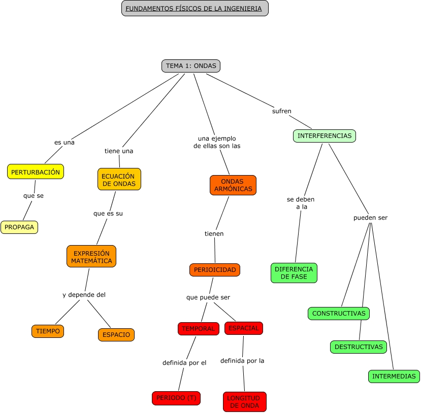 Este Cmap, tiene información relacionada con: Tema 1 Las Ondas, INTERFERENCIAS pueden ser DESTRUCTIVAS, TEMA 1: ONDAS una ejemplo de ellas son las ONDAS ARMÓNICAS, EXPRESIÓN MATEMÁTICA y depende del TIEMPO, ESPACIAL definida por la LONGITUD DE ONDA, TEMA 1: ONDAS sufren INTERFERENCIAS, TEMA 1: ONDAS tiene una ECUACIÓN DE ONDAS, PERTURBACIÓN que se PROPAGA, TEMA 1: ONDAS es una PERTURBACIÓN, PERIOICIDAD que puede ser ESPACIAL, PERIOICIDAD que puede ser TEMPORAL, ECUACIÓN DE ONDAS que es su EXPRESIÓN MATEMÁTICA, INTERFERENCIAS pueden ser CONSTRUCTIVAS, TEMPORAL definida por el PERIODO (T), INTERFERENCIAS pueden ser INTERMEDIAS, INTERFERENCIAS se deben a la DIFERENCIA DE FASE, EXPRESIÓN MATEMÁTICA y depende del ESPACIO, ONDAS ARMÓNICAS tienen PERIOICIDAD