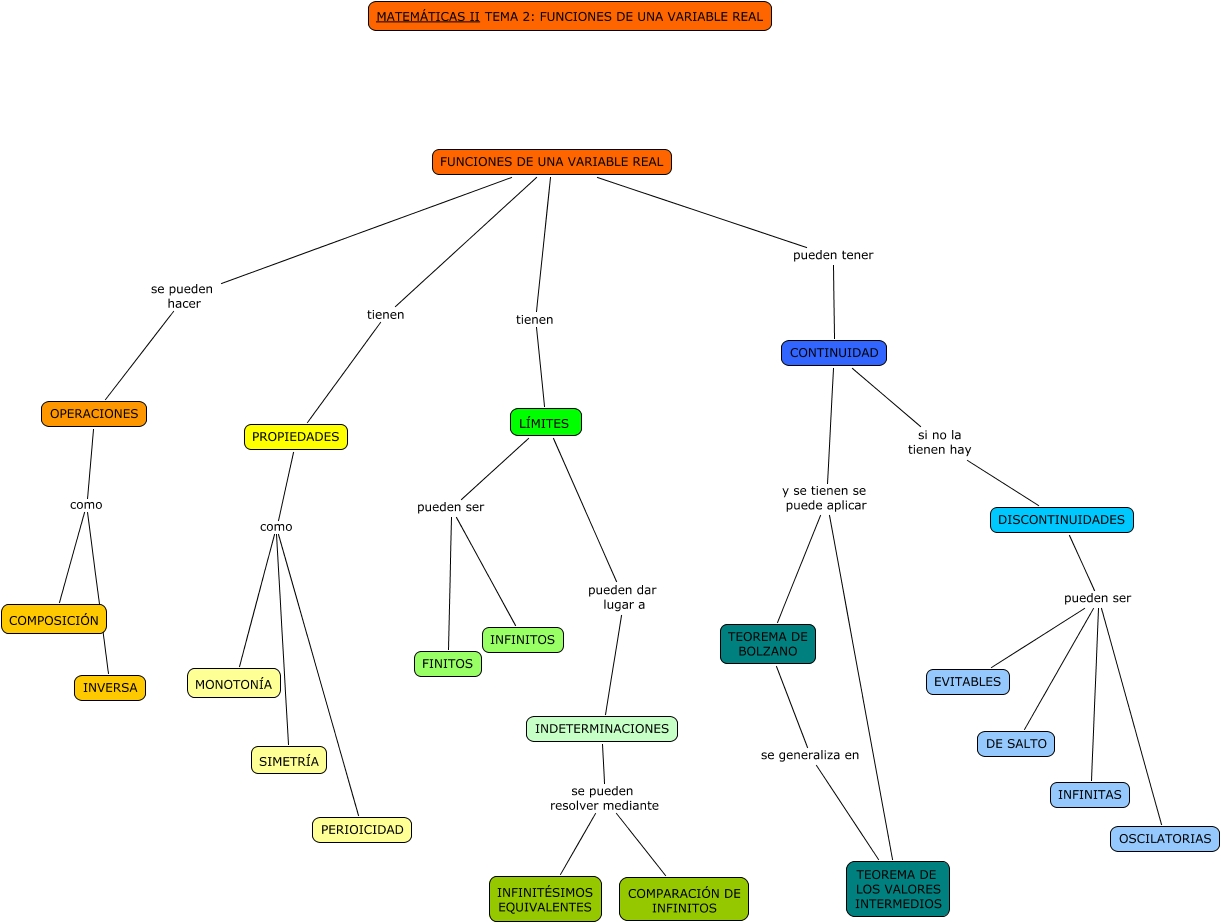 Este Cmap, tiene información relacionada con: Tema 2 Funciones R de una var R, FUNCIONES DE UNA VARIABLE REAL tienen PROPIEDADES, FUNCIONES DE UNA VARIABLE REAL tienen LÍMITES, FUNCIONES DE UNA VARIABLE REAL pueden tener CONTINUIDAD, CONTINUIDAD si no la tienen hay DISCONTINUIDADES, FUNCIONES DE UNA VARIABLE REAL se pueden hacer OPERACIONES, OPERACIONES como COMPOSICIÓN, PROPIEDADES como PERIOICIDAD, PROPIEDADES como MONOTONÍA, INDETERMINACIONES se pueden resolver mediante COMPARACIÓN DE INFINITOS, INDETERMINACIONES se pueden resolver mediante INFINITÉSIMOS EQUIVALENTES, LÍMITES pueden ser FINITOS, DISCONTINUIDADES pueden ser INFINITAS, TEOREMA DE BOLZANO se generaliza en TEOREMA DE LOS VALORES INTERMEDIOS, LÍMITES pueden dar lugar a INDETERMINACIONES, DISCONTINUIDADES pueden ser DE SALTO, LÍMITES pueden ser INFINITOS, PROPIEDADES como SIMETRÍA, DISCONTINUIDADES pueden ser OSCILATORIAS, CONTINUIDAD y se tienen se puede aplicar TEOREMA DE LOS VALORES INTERMEDIOS, DISCONTINUIDADES pueden ser EVITABLES