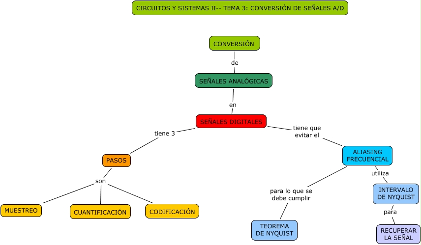 Este Cmap, tiene información relacionada con: Tema 3 Conversión analógico-digital, PASOS son CUANTIFICACIÓN, ALIASING FRECUENCIAL para lo que se debe cumplir TEOREMA DE NYQUIST, PASOS son CODIFICACIÓN, SEÑALES DIGITALES tiene 3 PASOS, CONVERSIÓN de SEÑALES ANALÓGICAS, ALIASING FRECUENCIAL utiliza INTERVALO DE NYQUIST, PASOS son MUESTREO, SEÑALES ANALÓGICAS en SEÑALES DIGITALES, SEÑALES DIGITALES tiene que evitar el ALIASING FRECUENCIAL, INTERVALO DE NYQUIST para RECUPERAR LA SEÑAL