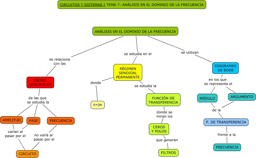 Este Cmap, tiene información relacionada con: Tema 7 Análisis en el dominio de la frecuencia, FASE varían al pasar por el CIRCUITO, CEROS Y POLOS que generan FILTROS, F. DE TRANSFERENCIA frente a la FRECUENCIA, RÉGIMEN SENOIDAL PERMANENTE donde s=jw, DIAGRAMAS DE BODE en los que se representa el MÓDULO, RÉGIMEN SENOIDAL PERMANENTE se estudia la FUNCIÓN DE TRANSFERENCIA, ANÁLISIS EN EL DOMINIO DE LA FRECUENCIA se utilizan DIAGRAMAS DE BODE, FUNCIÓN DE TRANSFERENCIA donde se miran los CEROS Y POLOS, FRECUENCIA no varía al pasar por el CIRCUITO, ANÁLISIS EN EL DOMINIO DE LA FRECUENCIA se relaciona con las ONDAS SENOIDALES, ONDAS SENOIDALES de las que se estudia la AMPLITUD, DIAGRAMAS DE BODE en los que se representa el ARGUMENTO, ANÁLISIS EN EL DOMINIO DE LA FRECUENCIA se estudia en el RÉGIMEN SENOIDAL PERMANENTE, ONDAS SENOIDALES de las que se estudia la FRECUENCIA, AMPLITUD varían al pasar por el CIRCUITO, ARGUMENTO de la F. DE TRANSFERENCIA, MÓDULO de la F. DE TRANSFERENCIA, ONDAS SENOIDALES de las que se estudia la FASE