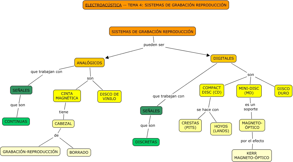 Este Cmap, tiene información relacionada con: Tema 4 Sistemas de grabación y reproducción, ANALÓGICOS que trabajan con SEÑALES, CINTA MAGNÉTICA tiene CABEZAL, SISTEMAS DE GRABACIÓN REPRODUCCIÓN pueden ser DIGITALES, SEÑALES que son DISCRETAS, SISTEMAS DE GRABACIÓN REPRODUCCIÓN pueden ser ANALÓGICOS, DIGITALES son COMPACT DISC (CD), SEÑALES que son CONTINUAS, CABEZAL de GRABACIÓN-REPRODUCCIÓN, DIGITALES que trabajan con SEÑALES, DIGITALES son MINI-DISC (MD), COMPACT DISC (CD) se hace con CRESTAS (PITS), MAGNETO- ÓPTICO por el efecto KERR MAGNETO-ÓPTICO, ANALÓGICOS son DISCO DE VINILO, MINI-DISC (MD) es un soporte MAGNETO- ÓPTICO, CABEZAL de BORRADO, ANALÓGICOS son CINTA MAGNÉTICA, DIGITALES son DISCO DURO, COMPACT DISC (CD) se hace con HOYOS (LANDS)