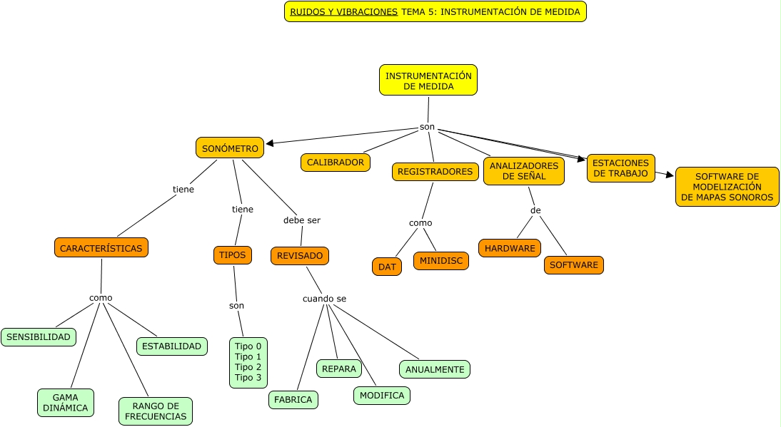 Este Cmap, tiene información relacionada con: Tema 5 Instrumentación de medida, ANALIZADORES DE SEÑAL de SOFTWARE, CARACTERÍSTICAS como RANGO DE FRECUENCIAS, REGISTRADORES como DAT, REGISTRADORES como MINIDISC, REVISADO cuando se ANUALMENTE, INSTRUMENTACIÓN DE MEDIDA son ESTACIONES DE TRABAJO, INSTRUMENTACIÓN DE MEDIDA son REGISTRADORES, CARACTERÍSTICAS como GAMA DINÁMICA, REVISADO cuando se REPARA, SONÓMETRO debe ser REVISADO, INSTRUMENTACIÓN DE MEDIDA son SONÓMETRO, SONÓMETRO tiene CARACTERÍSTICAS, CARACTERÍSTICAS como ESTABILIDAD, ANALIZADORES DE SEÑAL de HARDWARE, REVISADO cuando se MODIFICA, CARACTERÍSTICAS como SENSIBILIDAD, SONÓMETRO tiene TIPOS, INSTRUMENTACIÓN DE MEDIDA son CALIBRADOR, INSTRUMENTACIÓN DE MEDIDA son SOFTWARE DE MODELIZACIÓN DE MAPAS SONOROS, INSTRUMENTACIÓN DE MEDIDA son ANALIZADORES DE SEÑAL