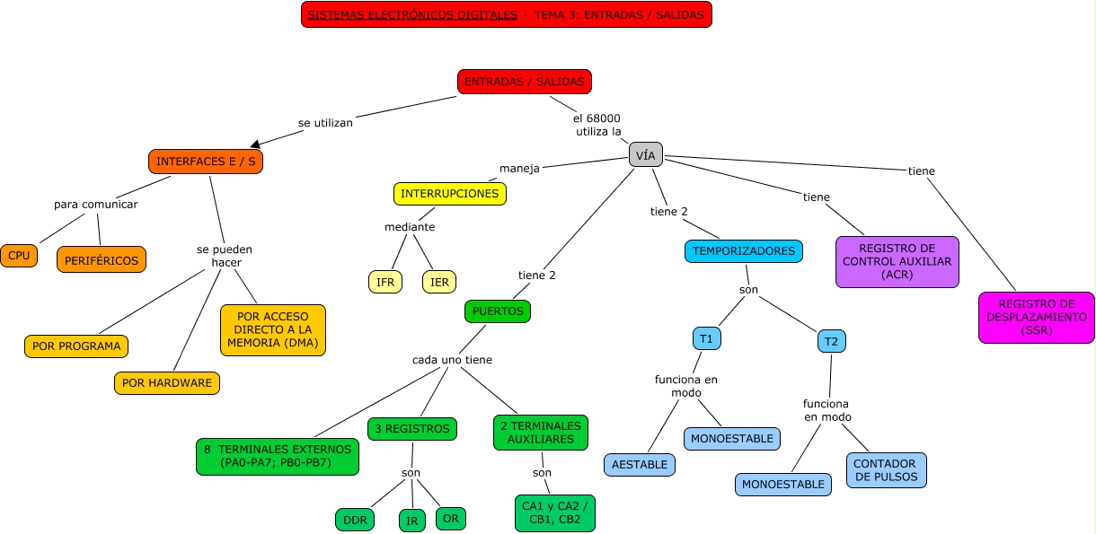 Este Cmap, tiene información relacionada con: Tema 3 Entradas - salidas, PUERTOS cada uno tiene 3 REGISTROS, INTERFACES E / S se pueden hacer POR ACCESO DIRECTO A LA MEMORIA (DMA), VÍA maneja INTERRUPCIONES, PUERTOS cada uno tiene 8 TERMINALES EXTERNOS (PA0-PA7; PB0-PB7), TEMPORIZADORES son T2, VÍA tiene 2 TEMPORIZADORES, INTERFACES E / S se pueden hacer POR PROGRAMA, INTERRUPCIONES mediante IER, 3 REGISTROS son OR, ENTRADAS / SALIDAS se utilizan INTERFACES E / S, T2 funciona en modo MONOESTABLE, 2 TERMINALES AUXILIARES son CA1 y CA2 / CB1, CB2, INTERFACES E / S se pueden hacer POR HARDWARE, 3 REGISTROS son IR, INTERFACES E / S para comunicar PERIFÉRICOS, T1 funciona en modo AESTABLE, VÍA tiene REGISTRO DE DESPLAZAMIENTO (SSR), PUERTOS cada uno tiene 2 TERMINALES AUXILIARES, 3 REGISTROS son DDR, INTERFACES E / S para comunicar CPU
