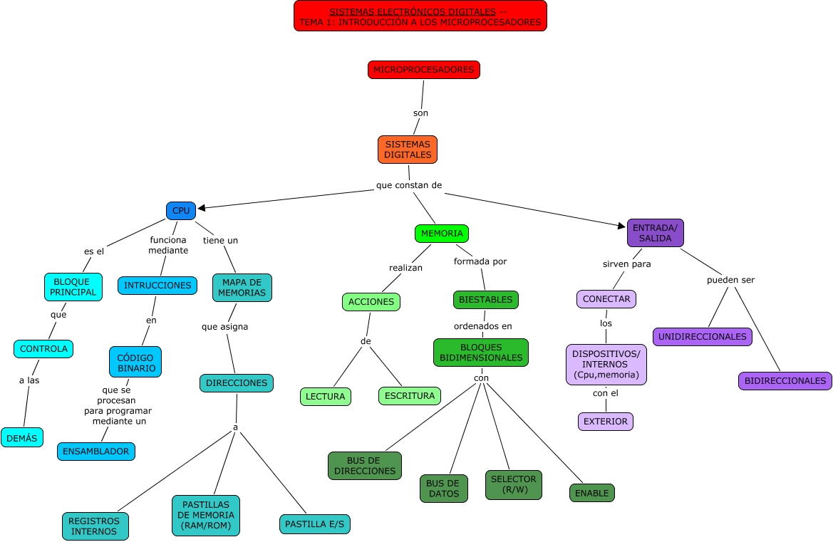 Este Cmap, tiene información relacionada con: Tema 1 Introducción a los microprocesadores, MAPA DE MEMORIAS que asigna DIRECCIONES, ENTRADA/ SALIDA pueden ser UNIDIRECCIONALES, ACCIONES de LECTURA, MEMORIA realizan ACCIONES, CONTROLA a las DEMÁS, DIRECCIONES a PASTILLA E/S, MEMORIA formada por BIESTABLES, ACCIONES de ESCRITURA, BLOQUES BIDIMENSIONALES con BUS DE DIRECCIONES, CPU es el BLOQUE PRINCIPAL, BLOQUES BIDIMENSIONALES con ENABLE, BLOQUES BIDIMENSIONALES con BUS DE DATOS, BIESTABLES ordenados en BLOQUES BIDIMENSIONALES, SISTEMAS DIGITALES que constan de MEMORIA, CPU tiene un MAPA DE MEMORIAS, SISTEMAS DIGITALES que constan de CPU, DISPOSITIVOS/ INTERNOS (Cpu,memoria) con el EXTERIOR, BLOQUES BIDIMENSIONALES con SELECTOR (R/W), MICROPROCESADORES son SISTEMAS DIGITALES, CPU funciona mediante INTRUCCIONES