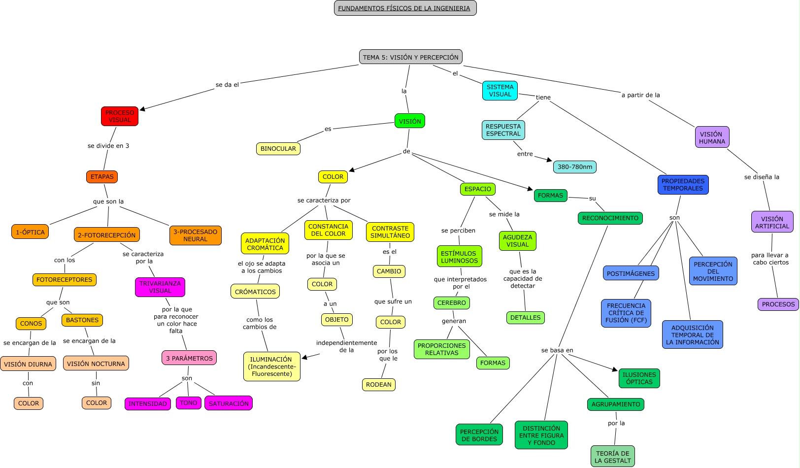 Este Cmap, tiene información relacionada con: Tema 5 Visión y percepción, VISIÓN HUMANA se diseña la VISIÓN ARTIFICIAL, RECONOCIMIENTO se basa en PERCEPCIÓN DE BORDES, COLOR se caracteriza por ADAPTACIÓN CROMÁTICA, FOTORECEPTORES que son CONOS, CONSTANCIA DEL COLOR por la que se asocia un COLOR, 3 PARÁMETROS son INTENSIDAD, AGUDEZA VISUAL que es la capacidad de detectar DETALLES, VISIÓN de FORMAS, FOTORECEPTORES que son BASTONES, CEREBRO generan FORMAS, SISTEMA VISUAL tiene RESPUESTA ESPECTRAL, AGRUPAMIENTO por la TEORÍA DE LA GESTALT, ESTÍMULOS LUMINOSOS que interpretados por el CEREBRO, PROPIEDADES TEMPORALES son ADQUISICIÓN TEMPORAL DE LA INFORMACIÓN, VISIÓN NOCTURNA sin COLOR, 2-FOTORECEPCIÓN se caracteriza por la TRIVARIANZA VISUAL, PROPIEDADES TEMPORALES son POSTIMÁGENES, 3 PARÁMETROS son TONO, BASTONES se encargan de la VISIÓN NOCTURNA, VISIÓN ARTIFICIAL para llevar a cabo ciertos PROCESOS