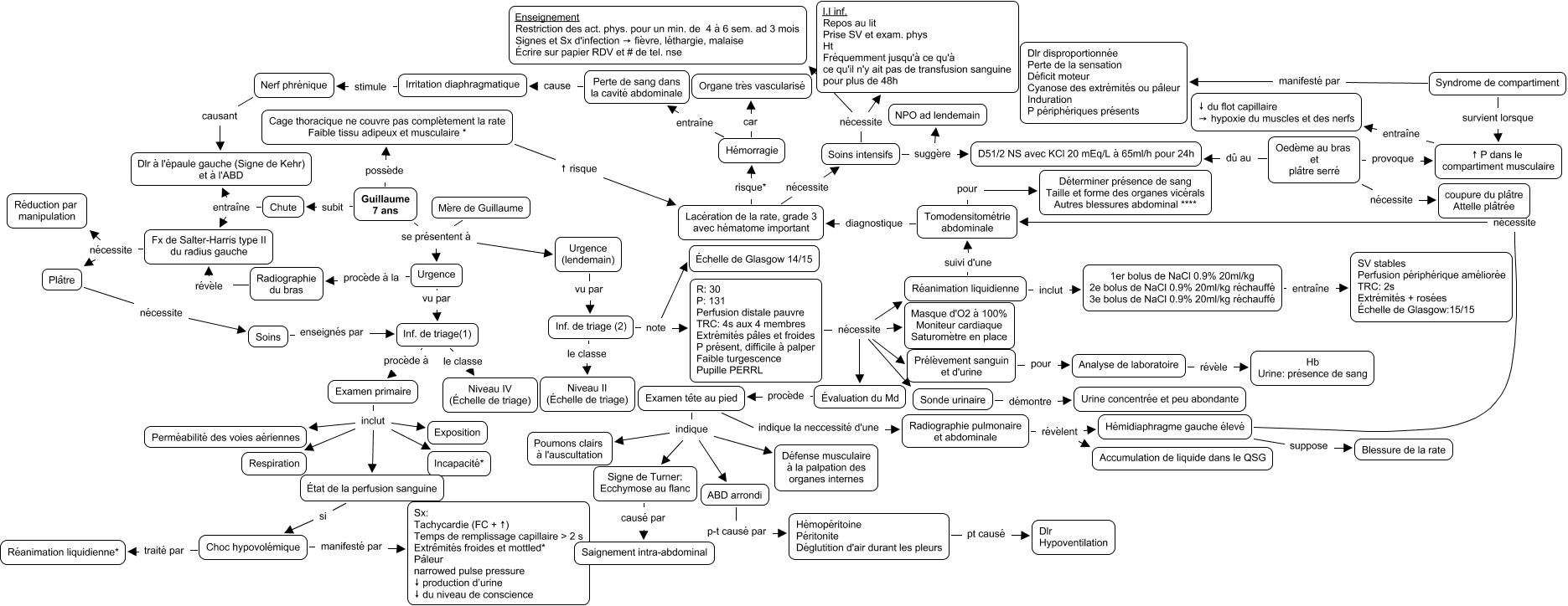 Cette carte conceptuelle, cree avec IHMC CmapTools, contient des informations liees a : APSIC 1 Soins critiques, Soins intensifs nécessite Enseignement Restriction des act. phys. pour un min. de 4 à 6 sem. ad 3 mois Signes et Sx d'infection → fièvre, léthargie, malaise Écrire sur papier RDV et # de tel. nse, Guillaume 7 ans subit Chute, Plâtre nécessite Soins, Examen primaire inclut Incapacité*, Examen tête au pied indique Défense musculaire à la palpation des organes internes, Examen primaire inclut Exposition, Guillaume 7 ans possède Cage thoracique ne couvre pas complètement la rate Faible tissu adipeux et musculaire *, Soins enseignés par Inf. de triage(1), Hémorragie car Organe très vascularisé, Inf. de triage (2) note Échelle de Glasgow 14/15, Examen tête au pied indique ABD arrondi, R: 30 P: 131 Perfusion distale pauvre TRC: 4s aux 4 membres Extrémités pâles et froides P présent, difficile à palper Faible turgescence Pupille PERRL nécessite Évaluation du Md, Urgence procède à la Radiographie du bras, Syndrome de compartiment survient lorsque ↑ P dans le compartiment musculaire, Fx de Salter-Harris type II du radius gauche nécessite Réduction par manipulation, Hémorragie entraîne Perte de sang dans la cavité abdominale, Lacération de la rate, grade 3 avec hématome important risque* Hémorragie, Examen primaire inclut Perméabilité des voies aériennes, Oedème au bras et plâtre serré provoque ↑ P dans le compartiment musculaire, Soins intensifs suggère NPO ad lendemain