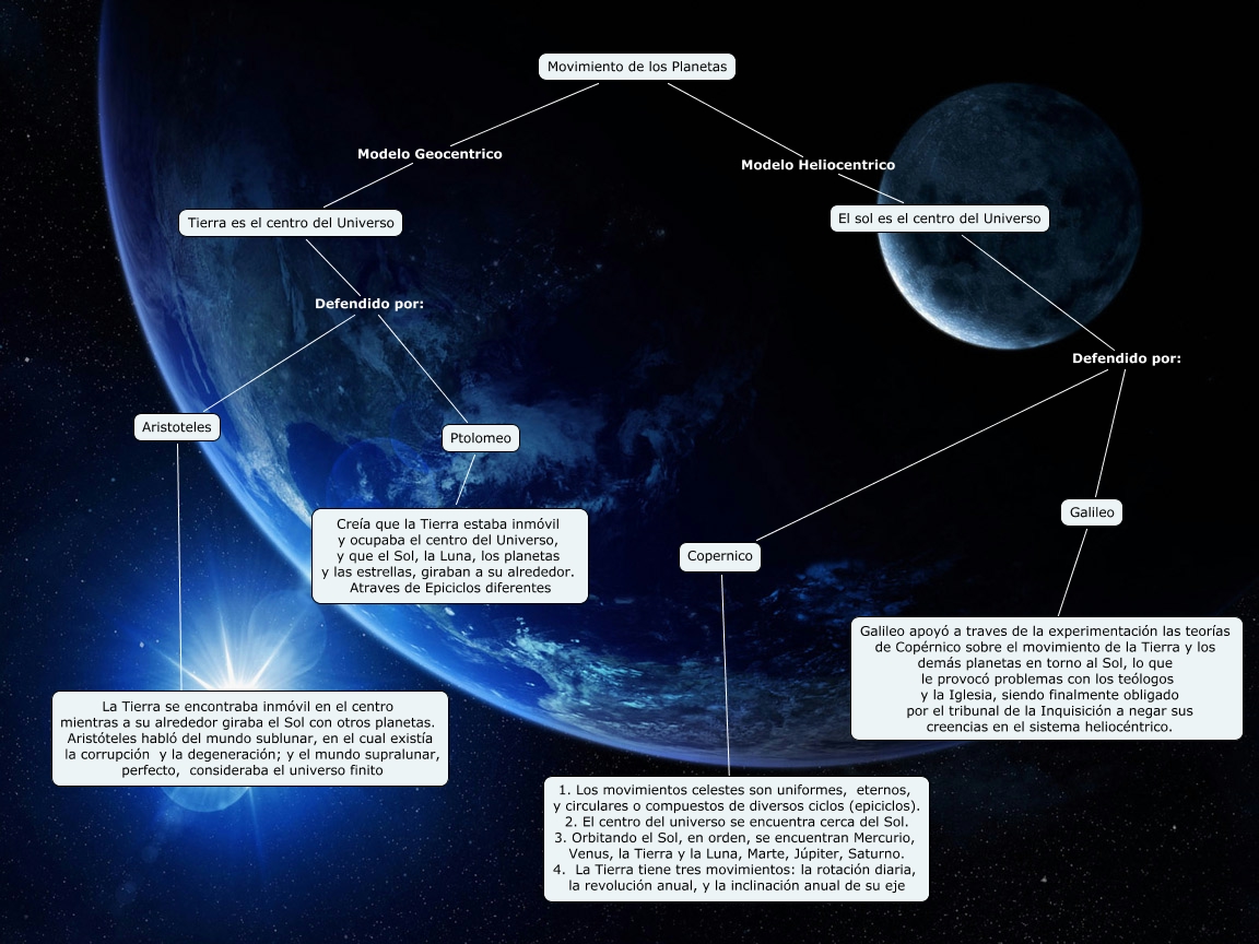 Este Cmap, tiene información relacionada con: Movimiento de los Planetas, Tierra es el centro del Universo Defendido por: Ptolomeo, Copernico ???? 1. Los movimientos celestes son uniformes, eternos, y circulares o compuestos de diversos ciclos (epiciclos). 2. El centro del universo se encuentra cerca del Sol. 3. Orbitando el Sol, en orden, se encuentran Mercurio, Venus, la Tierra y la Luna, Marte, Júpiter, Saturno. 4. La Tierra tiene tres movimientos: la rotación diaria, la revolución anual, y la inclinación anual de su eje, Tierra es el centro del Universo Defendido por: Aristoteles, Aristoteles ???? La Tierra se encontraba inmóvil en el centro mientras a su alrededor giraba el Sol con otros planetas. Aristóteles habló del mundo sublunar, en el cual existía la corrupción y la degeneración; y el mundo supralunar, perfecto, consideraba el universo finito, El sol es el centro del Universo Defendido por: Galileo, Ptolomeo ???? Creía que la Tierra estaba inmóvil y ocupaba el centro del Universo, y que el Sol, la Luna, los planetas y las estrellas, giraban a su alrededor. Atraves de Epiciclos diferentes, Movimiento de los Planetas Modelo Geocentrico Tierra es el centro del Universo, Movimiento de los Planetas Modelo Heliocentrico El sol es el centro del Universo, El sol es el centro del Universo Defendido por: Copernico, Galileo ???? Galileo apoyó a traves de la experimentación las teorías de Copérnico sobre el movimiento de la Tierra y los demás planetas en torno al Sol, lo que le provocó problemas con los teólogos y la Iglesia, siendo finalmente obligado por el tribunal de la Inquisición a negar sus creencias en el sistema heliocéntrico.