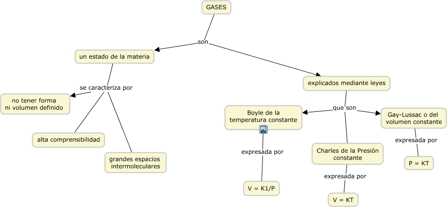 Este Cmap, tiene información relacionada con: estado gaseoso, Boyle de la temperatura constante expresada por V = K1/P, GASES son un estado de la materia, explicados mediante leyes que son Charles de la Presión constante, un estado de la materia se caracteriza por grandes espacios intermoleculares, un estado de la materia se caracteriza por alta comprensibilidad, explicados mediante leyes que son Boyle de la temperatura constante, un estado de la materia se caracteriza por no tener forma ni volumen definido, Gay-Lussac o del volumen constante expresada por P = KT, explicados mediante leyes que son Gay-Lussac o del volumen constante, Charles de la Presión constante expresada por V = KT, GASES son explicados mediante leyes