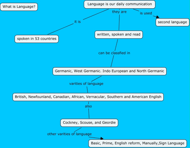 Este Cmap, tiene información relacionada con: Language, Language is our daily communication they are written, spoken and read, Language is our daily communication it is spoken in 53 countries, written, spoken and read can be classfied in Germanic, West Germanic. Indo European and North Germanic, British, Newfounland, Canadian, African, Vernacular, Southern and American English also Cockney, Scouse, and Geordie, Cockney, Scouse, and Geordie other varities of language Basic, Prime, English reform, Manually,Sign Language, Language is our daily communication is used second language, Germanic, West Germanic. Indo European and North Germanic varities of language British, Newfounland, Canadian, African, Vernacular, Southern and American English