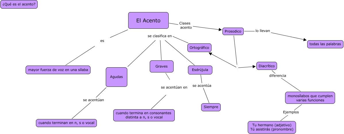 Este Cmap, tiene información relacionada con: Ortografía, Graves se clasifica en Esdrújula, Ortográfico se clasifica en Agudas, Esdrújula se acentúa Siempre, Prosodico Diacrítico, El Acento Clases acento Prosodico, Graves se acentúan en cuando termina en consonantes distinta a n, s o vocal, Prosodico lo llevan todas las palabras, Graves se clasifica en Agudas, Agudas se acentúan cuando terminan en n, s o vocal, monosílabos que cumplen varias funciones Ejemplos Tu hermano (adjetivo) Tú asistirás (pronombre), Diacrítico diferencia monosílabos que cumplen varias funciones, Prosodico Ortográfico, El Acento es mayor fuerza de voz en una sílaba, Ortográfico se clasifica en Esdrújula