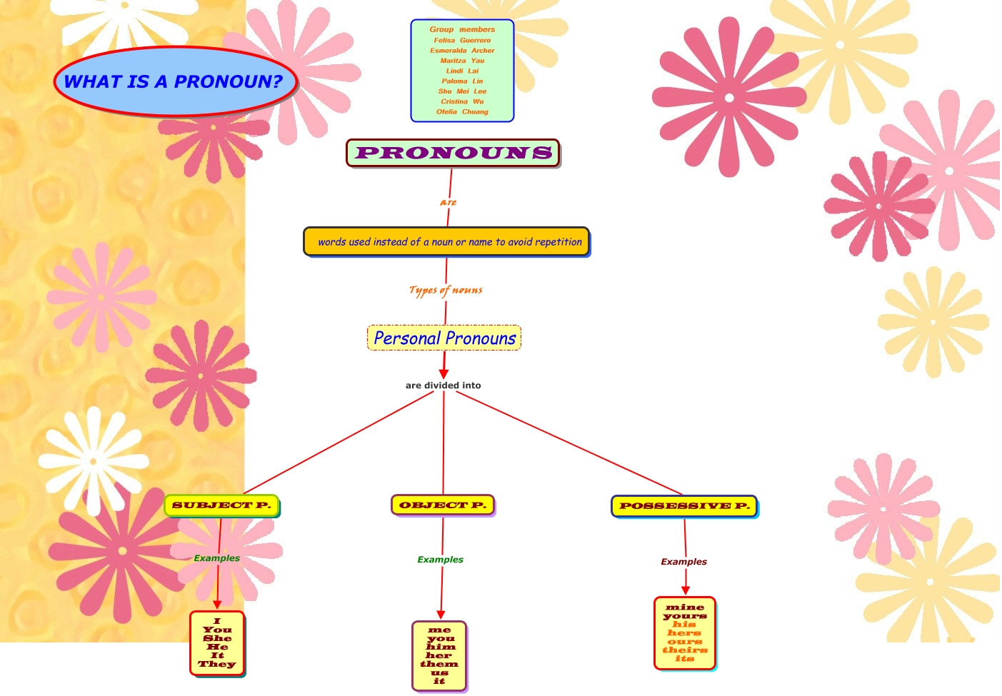 Este Cmap, tiene información relacionada con: Grammar Pronouns, Personal Pronouns are divided into POSSESSIVE P., words used instead of a noun or name to avoid repetition Types of nouns Personal Pronouns, OBJECT P. Examples me you him her them us it, SUBJECT P. Examples I You She He It They, Personal Pronouns are divided into OBJECT P., Personal Pronouns are divided into SUBJECT P., PRONOUNS are words used instead of a noun or name to avoid repetition, POSSESSIVE P. Examples mine yours his hers ours theirs its