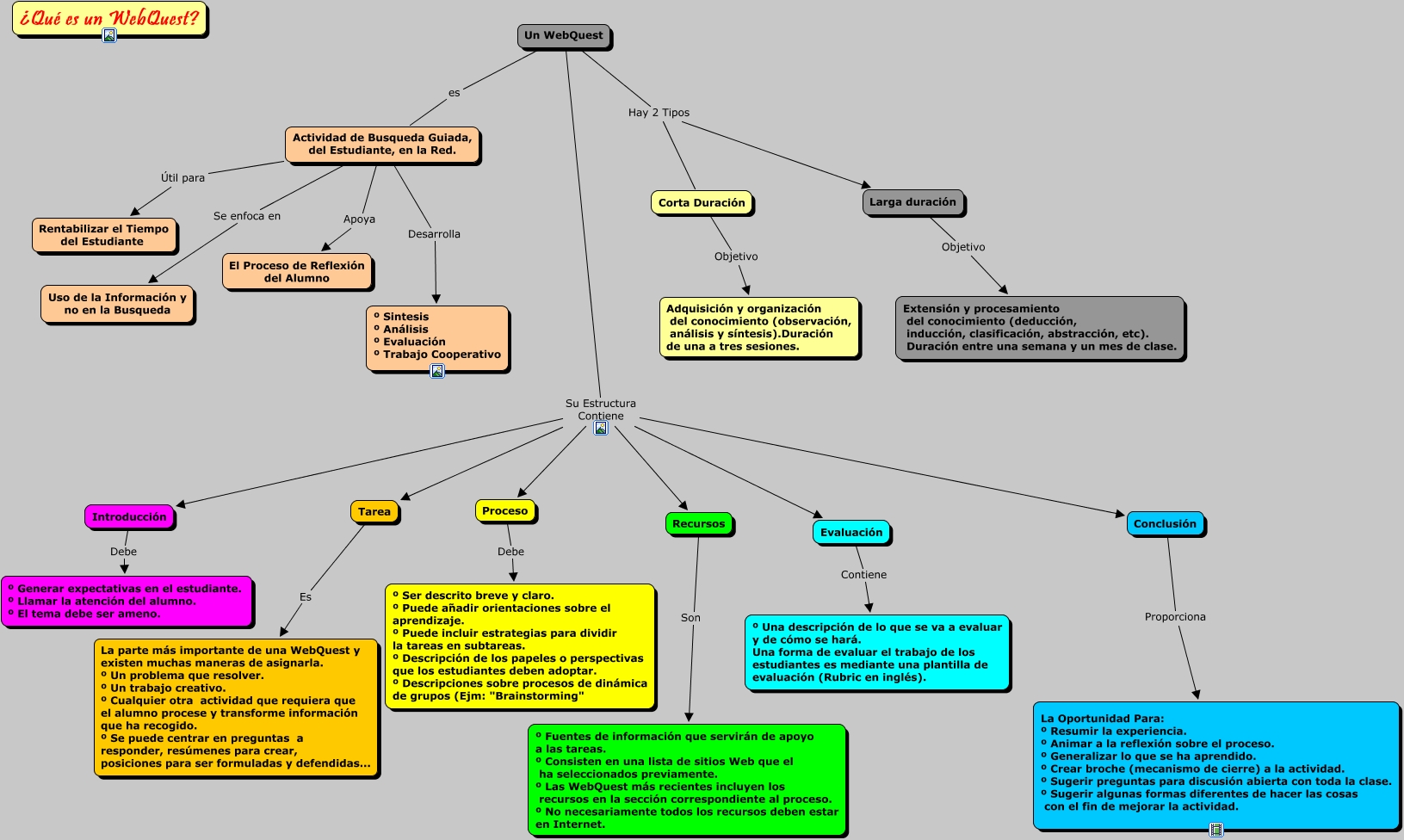 Este Cmap, tiene información relacionada con: WebQuest, Un WebQuest Su Estructura Contiene Tarea, Actividad de Busqueda Guiada, del Estudiante, en la Red. Útil para Rentabilizar el Tiempo del Estudiante, Un WebQuest Su Estructura Contiene Proceso, Un WebQuest Hay 2 Tipos Corta Duración, Proceso Debe º Ser descrito breve y claro. º Puede añadir orientaciones sobre el aprendizaje. º Puede incluir estrategias para dividir la tareas en subtareas. º Descripción de los papeles o perspectivas que los estudiantes deben adoptar. º Descripciones sobre procesos de dinámica de grupos (Ejm: "Brainstorming", Un WebQuest Su Estructura Contiene Conclusión, Un WebQuest Su Estructura Contiene Recursos, Corta Duración Objetivo Adquisición y organización del conocimiento (observación, análisis y síntesis).Duración de una a tres sesiones., Conclusión Proporciona La Oportunidad Para: º Resumir la experiencia. º Animar a la reflexión sobre el proceso. º Generalizar lo que se ha aprendido. º Crear broche (mecanismo de cierre) a la actividad. º Sugerir preguntas para discusión abierta con toda la clase. º Sugerir algunas formas diferentes de hacer las cosas con el fin de mejorar la actividad., Actividad de Busqueda Guiada, del Estudiante, en la Red. Apoya El Proceso de Reflexión del Alumno, Un WebQuest Su Estructura Contiene Evaluación, Un WebQuest Su Estructura Contiene Introducción, Tarea Es La parte más importante de una WebQuest y existen muchas maneras de asignarla. º Un problema que resolver. º Un trabajo creativo. º Cualquier otra actividad que requiera que el alumno procese y transforme información que ha recogido. º Se puede centrar en preguntas a responder, resúmenes para crear, posiciones para ser formuladas y defendidas..., Actividad de Busqueda Guiada, del Estudiante, en la Red. Se enfoca en Uso de la Información y no en la Busqueda, Larga duración Objetivo Extensión y procesamiento del conocimiento (deducción, inducción, clasificación, abstracción, etc). Duración entre una semana y un mes de clase., Un WebQuest es Actividad de Busqueda Guiada, del Estudiante, en la Red., Recursos Son º Fuentes de información que servirán de apoyo a las tareas. º Consisten en una lista de sitios Web que el ha seleccionados previamente. º Las WebQuest más recientes incluyen los recursos en la sección correspondiente al proceso. º No necesariamente todos los recursos deben estar en Internet., Evaluación Contiene º Una descripción de lo que se va a evaluar y de cómo se hará. Una forma de evaluar el trabajo de los estudiantes es mediante una plantilla de evaluación (Rubric en inglés)., Un WebQuest Hay 2 Tipos Larga duración, Actividad de Busqueda Guiada, del Estudiante, en la Red. Desarrolla º Sintesis º Análisis º Evaluación º Trabajo Cooperativo