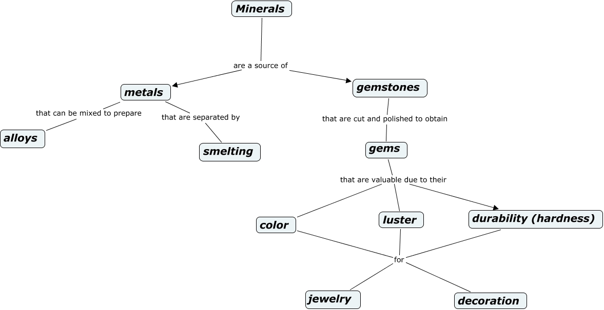 Este Cmap, tiene información relacionada con: Chapter 2 Section 3 (part 2), metals that are separated by smelting, durability (hardness) for decoration, metals that can be mixed to prepare alloys, color for decoration, gems that are valuable due to their durability (hardness), gemstones that are cut and polished to obtain gems, gems that are valuable due to their color, durability (hardness) for jewelry, color for jewelry, luster for decoration, Minerals are a source of gemstones, luster for jewelry, Minerals are a source of metals, gems that are valuable due to their luster