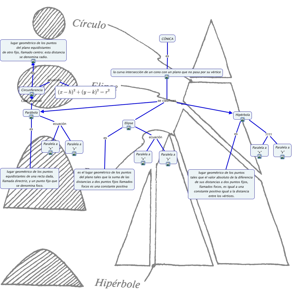 Este Cmap, tiene información relacionada con: Conicas, la curva intersección de un cono con un plano que no pasa por su vértice se clasifican Parábola, Elipse es es el lugar geométrico de los puntos del plano tales que la suma de las distancias a dos puntos fijos llamados focos es una constante positiva, Hipérbola ???? Paralela a "y", la curva intersección de un cono con un plano que no pasa por su vértice se clasifican Hipérbola, la curva intersección de un cono con un plano que no pasa por su vértice se clasifican Elipse, Parábola ecuación Paralela a "x", Parábola ecuación Paralela a "y", Elipse ecuación Paralela a "y", Hipérbola ???? Paralela a "x", Hipérbola es lugar geométrico de los puntos tales que el valor absoluto de la diferencia de sus distancias a dos puntos fijos, llamados focos, es igual a una constante positiva igual a la distancia entre los vértices., Parábola es lugar geométrico de los puntos equidistantes de una recta dada, llamada directriz, y un punto fijo que se denomina foco., Circunferencia es lugar geométrico de los puntos del plano equidistantes de otro fijo, llamado centro; esta distancia se denomina radio., Elipse ecuación Paralela a "x", Parábola Caso especial Circunferencia, CÓNICA es la curva intersección de un cono con un plano que no pasa por su vértice, Circunferencia ecuación