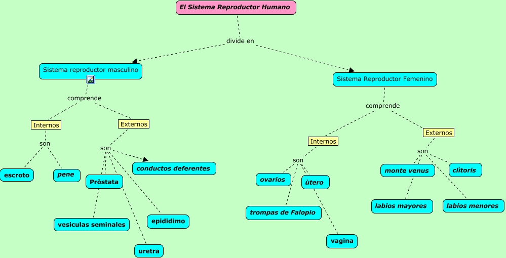 Este Cmap, tiene información relacionada con: Sistema reproductor, Internos son pene, Internos son trompas de Falopio, Externos son labios menores, Internos son ùtero, El Sistema Reproductor Humano divide en Sistema Reproductor Femenino, Externos son monte venus, Sistema reproductor masculino comprende Internos, Sistema reproductor masculino comprende Externos, Sistema Reproductor Femenino comprende Externos, Internos son escroto, Externos son clìtoris, Externos son conductos deferentes, Externos son uretra, Sistema Reproductor Femenino comprende Internos, El Sistema Reproductor Humano divide en Sistema reproductor masculino, Externos son labios mayores, Externos son Pròstata, Externos son vesiculas seminales, Internos son ovarios, Externos son epididimo