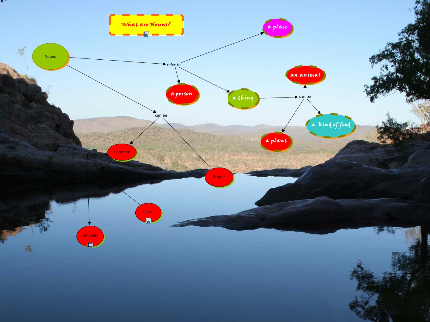 Este Cmap, tiene información relacionada con: Kinds of Nouns, Common of two kinds Singular, a thing can be a plant, Common of two kinds Plural, a thing can be an animal, Nouns can be Common, Nouns can be Proper, a thing can be a kind of food, Nouns refer to a thing, Nouns refer to a person, Nouns refer to a place