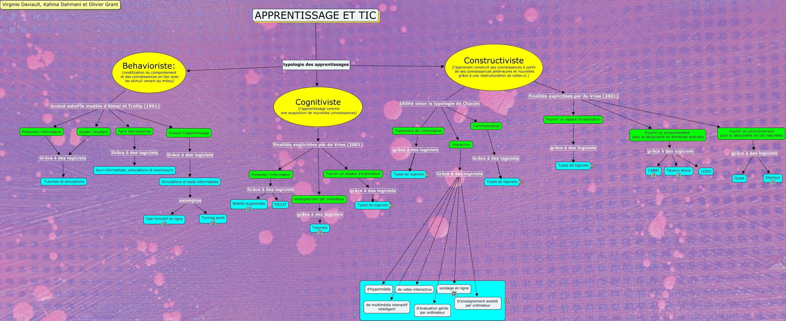Cette carte conceptuelle, cree avec IHMC CmapTools, contient des informations liees a : groupe 3 cmap 1, Cognitiviste (l'apprentissage comme une acquisition de nouvelles connaissances) finalités explicitées par de Vries (2001) enseignement par ordinateur, APPRENTISSAGE ET TIC typologie des apprentissages Constructiviste (l'apprenant construit ses connaissances à partir de ses connaissances antérieures et nouvelles grâce à une restructuration de celles-ci.), Interaction Grâce à des logiciels d'hypermédia, Constructiviste (l'apprenant construit ses connaissances à partir de ses connaissances antérieures et nouvelles grâce à une restructuration de celles-ci.) finalités explicitées par de Vries (2001) Fournir un espace d'exploration, Simulations et tests informatisés exemples Test formatif en ligne, Traitement de l'information grâce à des logiciels Édition électronique, Fournir un environnement pour la découverte de lois naturelles grâce à des logiciels Sherlock, Communication Grâce à des logiciels Courrier électronique (liste de diffusion, gmail, hotmail), Constructiviste (l'apprenant construit ses connaissances à partir de ses connaissances antérieures et nouvelles grâce à une restructuration de celles-ci.) Utilité selon la typologie de Chacòn Interaction, Interaction Grâce à des logiciels de vidéo interactive, Fournir un environnement pour la découverte de domaines abstraits grâce à des logiciels LOGO, Traitement de l'information grâce à des logiciels traitement numérique (Excel, numbers), Behavioriste: (modification du comportement et des connaissances en lien avec les stimuli venant du milieu) évalué selon le modèle d'Alessi et Trollip (1991) Évaluer l'apprentissage, Traitement de l'information grâce à des logiciels Systèmes intégrés, Fournir un espace d'exploration grâce à des logiciels Citizen Kane, Traitement de l'information grâce à des logiciels Dessin assisté par ordinateur, Fournir un espace d'exploration grâce à des logiciels Perseus, Constructiviste (l'apprenant construit ses connaissances à partir de ses connaissances antérieures et nouvelles grâce à une restructuration de celles-ci.) finalités explicitées par de Vries (2001) Fournir un environnement pour la découverte de lois naturelles, Behavioriste: (modification du comportement et des connaissances en lien avec les stimuli venant du milieu) évalué selon le modèle d'Alessi et Trollip (1991) Guider l'étudiant, Constructiviste (l'apprenant construit ses connaissances à partir de ses connaissances antérieures et nouvelles grâce à une restructuration de celles-ci.) Utilité selon la typologie de Chacòn Traitement de l'information