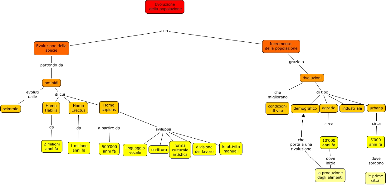 Questa Cmap, creata con IHMC CmapTools, contiene informazioni relative a: Evoluzione popolazione, rivoluzioni che migliorano condizioni di vita, Evoluzione della specie partendo da ominidi, Homo sapiens sviluppa divisione del lavoro, ominidi di cui Homo Erectus, rivoluzioni di tipo urbana, 5'000 anni fa dove sorgono le prime città, agrario circa 10'000 anni fa, Homo Habilis da 2 milioni anni fa, Evoluzione della popolazione con Incremento della popolazione, Homo sapiens sviluppa linguaggio vocale, Incremento della popolazione grazie a rivoluzioni, ominidi evoluti dalle scimmie, rivoluzioni di tipo agrario, rivoluzioni di tipo demografico, urbana circa 5'000 anni fa, Homo sapiens a partire da 500'000 anni fa, Homo sapiens sviluppa le attività manuali, Homo sapiens sviluppa scrittura, ominidi di cui Homo sapiens, Homo sapiens sviluppa forma culturale artistica
