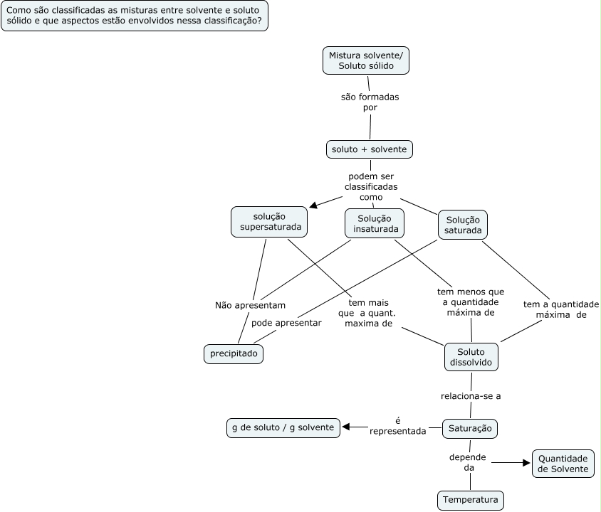 Esse mapa conceitual, produzido no IHMC CmapTools, tem a informação relacionada a: classificação 3B, Solução saturada tem a quantidade máxima de Soluto dissolvido, Saturação depende da Quantidade de Solvente, Saturação depende da Temperatura, soluto + solvente podem ser classificadas como Solução insaturada, Solução saturada pode apresentar precipitado, Soluto dissolvido relaciona-se a Saturação, Saturação é representada g de soluto / g solvente, Solução insaturada tem menos que a quantidade máxima de Soluto dissolvido, soluto + solvente podem ser classificadas como Solução saturada, solução supersaturada Não apresentam precipitado, Solução insaturada Não apresentam precipitado, solução supersaturada tem mais que a quant. maxima de Soluto dissolvido, Mistura solvente/ Soluto sólido são formadas por soluto + solvente, soluto + solvente podem ser classificadas como solução supersaturada