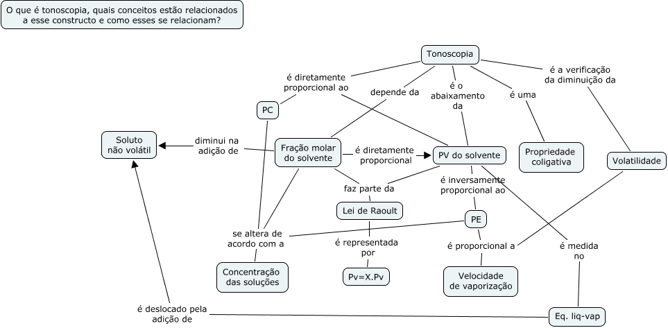 Esse mapa conceitual, produzido no IHMC CmapTools, tem a informação relacionada a: tonoscopia 3B, Fração molar do solvente é diretamente proporcional PV do solvente, PV do solvente é medida no Eq. liq-vap, Tonoscopia é o abaixamento da PV do solvente, Tonoscopia depende da Fração molar do solvente, PV do solvente é diretamente proporcional ao PC, PV do solvente é inversamente proporcional ao PE, Lei de Raoult é representada por Pv=X.Pv, PV do solvente faz parte da Lei de Raoult, PE se altera de acordo com a Concentração das soluções, Eq. liq-vap é deslocado pela adição de Soluto não volátil, PC se altera de acordo com a Concentração das soluções, Tonoscopia é uma Propriedade coligativa, Tonoscopia é a verificação da diminuição da Volatilidade, Tonoscopia é diretamente proporcional ao PC, Fração molar do solvente se altera de acordo com a Concentração das soluções, PE é proporcional a Velocidade de vaporização, Fração molar do solvente faz parte da Lei de Raoult, Volatilidade é proporcional a Velocidade de vaporização, Fração molar do solvente diminui na adição de Soluto não volátil