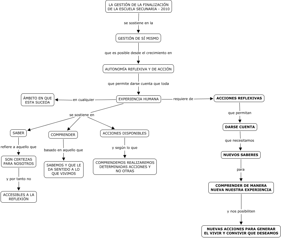 Este Cmap, tiene información relacionada con: Gestión de sí mismo y los tres pilares, COMPRENDER basado en aquello que SABEMOS Y QUE LE DA SENTIDO A LO QUE VIVIMOS, ACCIONES DISPONIBLES y según lo que COMPRENDEMOS REALIZAREMOS DETERMINADAS ACCIONES Y NO OTRAS, ACCIONES REFLEXIVAS que permitan DARSE CUENTA, DARSE CUENTA que necesitamos NUEVOS SABERES, AUTONOMÍA REFLEXIVA Y DE ACCIÓN que permite darse cuenta que toda EXPERIENCIA HUMANA, EXPERIENCIA HUMANA en cualquier ÁMBITO EN QUE ESTA SUCEDA, COMPRENDER DE MANERA NUEVA NUESTRA EXPERIENCIA y nos posibiliten NUEVAS ACCIONES PARA GENERAR EL VIVIR Y CONVIVIR QUE DESEAMOS, EXPERIENCIA HUMANA se sostiene en ACCIONES DISPONIBLES, NUEVOS SABERES para COMPRENDER DE MANERA NUEVA NUESTRA EXPERIENCIA, EXPERIENCIA HUMANA se sostiene en SABER, LA GESTIÓN DE LA FINALIZACIÓN DE LA ESCUELA SECUNARIA - 2010 se sostiene en la GESTIÓN DE SÍ MISMO, GESTIÓN DE SÍ MISMO que es posible desde el crecimiento en AUTONOMÍA REFLEXIVA Y DE ACCIÓN, SON CERTEZAS PARA NOSOTROS y por tanto no ACCESIBLES A LA REFLEXIÓN, EXPERIENCIA HUMANA requiere de ACCIONES REFLEXIVAS, EXPERIENCIA HUMANA se sostiene en COMPRENDER, SABER refiere a aquello que SON CERTEZAS PARA NOSOTROS