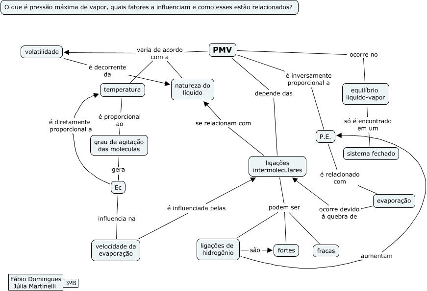 Esse mapa conceitual, produzido no IHMC CmapTools, tem a informação relacionada a: Cópia de Jú e Fá, ligações de hidrogênio aumentam P.E., ligações intermoleculares podem ser ligações de hidrogênio, PMV depende das ligações intermoleculares, grau de agitação das moleculas gera Ec, ligações intermoleculares podem ser fortes, PMV varia de acordo com a volatilidade, volatilidade é decorrente da natureza do líquido, PMV varia de acordo com a natureza do líquido, PMV varia de acordo com a temperatura, ligações de hidrogênio são fortes, evaporação ocorre devido à quebra de ligações intermoleculares, PMV ocorre no equilíbrio liquido-vapor, P.E. é relacionado com evaporação, equilíbrio liquido-vapor só é encontrado em um sistema fechado, ligações intermoleculares se relacionam com natureza do líquido, PMV é inversamente proporcional a P.E., Ec influencia na velocidade da evaporação, velocidade da evaporação é influenciada pelas ligações intermoleculares, temperatura é proporcional ao grau de agitação das moleculas, ligações intermoleculares podem ser fracas