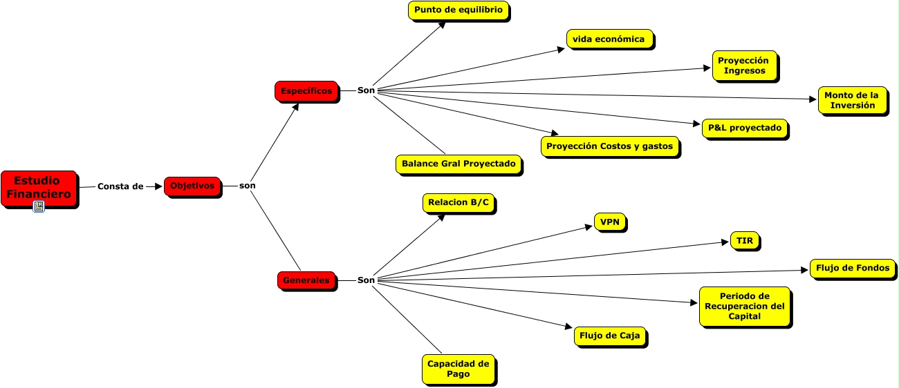 Este Cmap, tiene información relacionada con: EstudioFinanciero, Específicos Son P&L proyectado, Específicos Son vida económica, Objetivos son Específicos, Generales Son Periodo de Recuperacion del Capital, Específicos Son Proyección Ingresos, Estudio Financiero Consta de Objetivos, Específicos Son Balance Gral Proyectado, Objetivos son Generales, Específicos Son Proyección Costos y gastos, Generales Son TIR, Generales Son Flujo de Fondos, Generales Son Capacidad de Pago, Específicos Son Punto de equilibrio, Generales Son Relacion B/C, Generales Son VPN, Específicos Son Monto de la Inversión, Generales Son Flujo de Caja