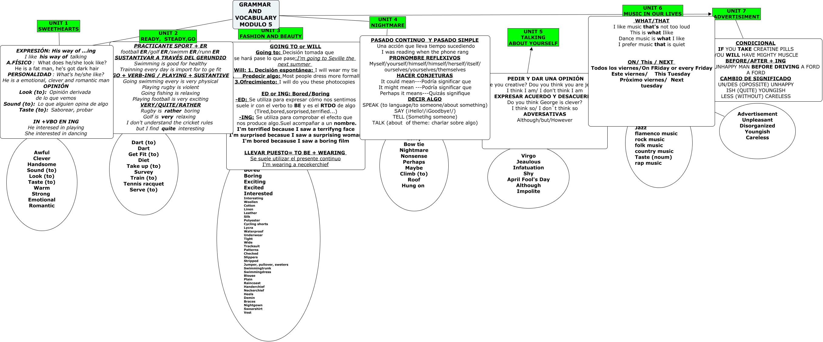 Este mapa conceptual tiene información relacionada a: MÓDULO 5, UNIT 7 ADVERTISIMENT ???? CONDICIONAL IF YOU TAKE CREATINE PILLS YOU WILL HAVE MIGHTY MUSCLE BEFORE/AFTER + ING I WAS A UNHAPPY MAN BEFORE DRIVING A FORD A FORD CAMBIO DE SIGNIFICADO UN/DES (OPOSSITE) UNHAPPY ISH (QUITE) YOUNGISH LESS (WITHOUT) CARELESS, PEDIR Y DAR UNA OPINIÓN Are you creative? Dou you think you are jealous? I think I am/ I don't think I am EXPRESAR ACUERDO Y DESACUERDO Do you think George is clever? I think so/ I don`t think so ADVERSATIVAS Although/but/However ???? UNIT 5 TALKING ABOUT YOURSELF, EXPRESIÓN: His way of ...ing I like his way of talking A.FÍSICO: What does he/she look like? He is a fat man, he's got dark hair PERSONALIDAD: What's he/she like? He is a emotional, clever and romantic man OPINIÓN Look (to): Opinión derivada de lo que vemos Sound (to): Lo que alguien opina de algo Taste (to): Saborear, probar IN +VBO EN ING He interesed in playing She interested in dancing ???? Awful Clever Handsome Sound (to) Look (to) Taste (to) Warm Strong Emotional Romantic, UNIT 3 FASHION AND BEAUTY ???? GOING TO or WILL Going to: Decisión tomada que se hará pase lo que pase:I'm going to Seville the next summer Will: 1. Decisión espontánea: I will wear my tie 2. Predecir algo: Most people dress more formally 3.Ofrecimiento: I will do you these photocopies ED or ING: Bored/Boring -ED: Se utiliza para expresar cómo nos sentimos suele ir con el verbo to BE y es el RTDO de algo (Tired,bored,sorprised,terrified...) -ING: Se utiliza para comprobar el efecto que nos produce algo.Suel acompañar a un nombre. I'm terrified because I saw a terrifyng face I'm surprised becasue I saw a surprising woman I'm bored becasuse I saw a boring film LLEVAR PUESTO= TO BE + WEARING Se suele utilizar el presente continuo I'm wearing a necekerchief, CONDICIONAL IF YOU TAKE CREATINE PILLS YOU WILL HAVE MIGHTY MUSCLE BEFORE/AFTER + ING I WAS A UNHAPPY MAN BEFORE DRIVING A FORD A FORD CAMBIO DE SIGNIFICADO UN/DES (OPOSSITE) UNHAPPY ISH (QUITE) YOUNGISH LESS (WITHOUT) CARELESS ???? Advertisement Unpleasant Disorganized Youngish Careless, UNIT 4 NIGHTMARE ???? PASADO CONTINUO Y PASADO SIMPLE Una acción que lleva tiempo sucediendo I was reading when the phone rang PRONOMBRE REFLEXIVOS Myself/yourself/himself/himself/herself/itself/ ourselves/yourselves/themselves HACER CONJETURAS It could mean---Podría significar que It might mean ---Podría significar que Perhaps it means---Quizás signifique DECIR ALGO SPEAK (to language/to someone/about something) SAY (¡Hello!/¡Goodbye!/) TELL (Sometihg someone) TALK (about of theme: charlar sobre algo), PRACTICANTE SPORT + ER footballER/golfER/swimmER/runnER SUSTANTIVAR A TRAVÉS DEL GERUNDIO Swimming is good for healthy Trainning every day is import for to ge fit GO + VERB-ING / PLAYING + SUSTANTIVE Going swimming every is very physical Playing rugby is violent Going fishing is relaxing Playing football is very exciting VERY/QUITE/RATHER Rugby is rather boring Golf is very relaxing I don't understand the cricket rules but I find quite interesting ???? Dart (to) Dart Get Fit (to) Diet Take up (to) Survey Train (to) Tennis racquet Serve (to), UNIT 1 SWEETHEARTS ???? EXPRESIÓN: His way of ...ing I like his way of talking A.FÍSICO: What does he/she look like? He is a fat man, he's got dark hair PERSONALIDAD: What's he/she like? He is a emotional, clever and romantic man OPINIÓN Look (to): Opinión derivada de lo que vemos Sound (to): Lo que alguien opina de algo Taste (to): Saborear, probar IN +VBO EN ING He interesed in playing She interested in dancing, GRAMMAR AND VOCABULARY MODULO 5 ???? EXPRESIÓN: His way of ...ing I like his way of talking A.FÍSICO: What does he/she look like? He is a fat man, he's got dark hair PERSONALIDAD: What's he/she like? He is a emotional, clever and romantic man OPINIÓN Look (to): Opinión derivada de lo que vemos Sound (to): Lo que alguien opina de algo Taste (to): Saborear, probar IN +VBO EN ING He interesed in playing She interested in dancing, UNIT 6 MUSIC IN OUR LIVES ???? WHAT/THAT I like music that's not too loud This is what Ilike Dance music is what I like I prefer music that is quiet ON/ This / NEXT Todos los viernes/On FRiday or every Friday Este viernes/ This Tuesday Próximo viernes/ Next tuesday, UNIT 2 READY, STEADY,GO ???? PRACTICANTE SPORT + ER footballER/golfER/swimmER/runnER SUSTANTIVAR A TRAVÉS DEL GERUNDIO Swimming is good for healthy Trainning every day is import for to ge fit GO + VERB-ING / PLAYING + SUSTANTIVE Going swimming every is very physical Playing rugby is violent Going fishing is relaxing Playing football is very exciting VERY/QUITE/RATHER Rugby is rather boring Golf is very relaxing I don't understand the cricket rules but I find quite interesting, UNIT 3 FASHION AND BEAUTY ???? GRAMMAR AND VOCABULARY MODULO 5, UNIT 4 NIGHTMARE ???? GRAMMAR AND VOCABULARY MODULO 5, GOING TO or WILL Going to: Decisión tomada que se hará pase lo que pase:I'm going to Seville the next summer Will: 1. Decisión espontánea: I will wear my tie 2. Predecir algo: Most people dress more formally 3.Ofrecimiento: I will do you these photocopies ED or ING: Bored/Boring -ED: Se utiliza para expresar cómo nos sentimos suele ir con el verbo to BE y es el RTDO de algo (Tired,bored,sorprised,terrified...) -ING: Se utiliza para comprobar el efecto que nos produce algo.Suel acompañar a un nombre. I'm terrified because I saw a terrifyng face I'm surprised becasue I saw a surprising woman I'm bored becasuse I saw a boring film LLEVAR PUESTO= TO BE + WEARING Se suele utilizar el presente continuo I'm wearing a necekerchief ???? Fashion Hair up Trainers Bored Boring Exciting Excited Interested Interesting Woollen Cotton Linen Leather Silk Polyester Cycling shorts Lycra Waterproof Underwear Tight Wide Tracksuit Patterns Checked Slippers Stripped Jumper, pullover, sweters Swimmingtrunk Swimmingdress Blouse Plain Raincoast Handerchief Neckerchief Heels D